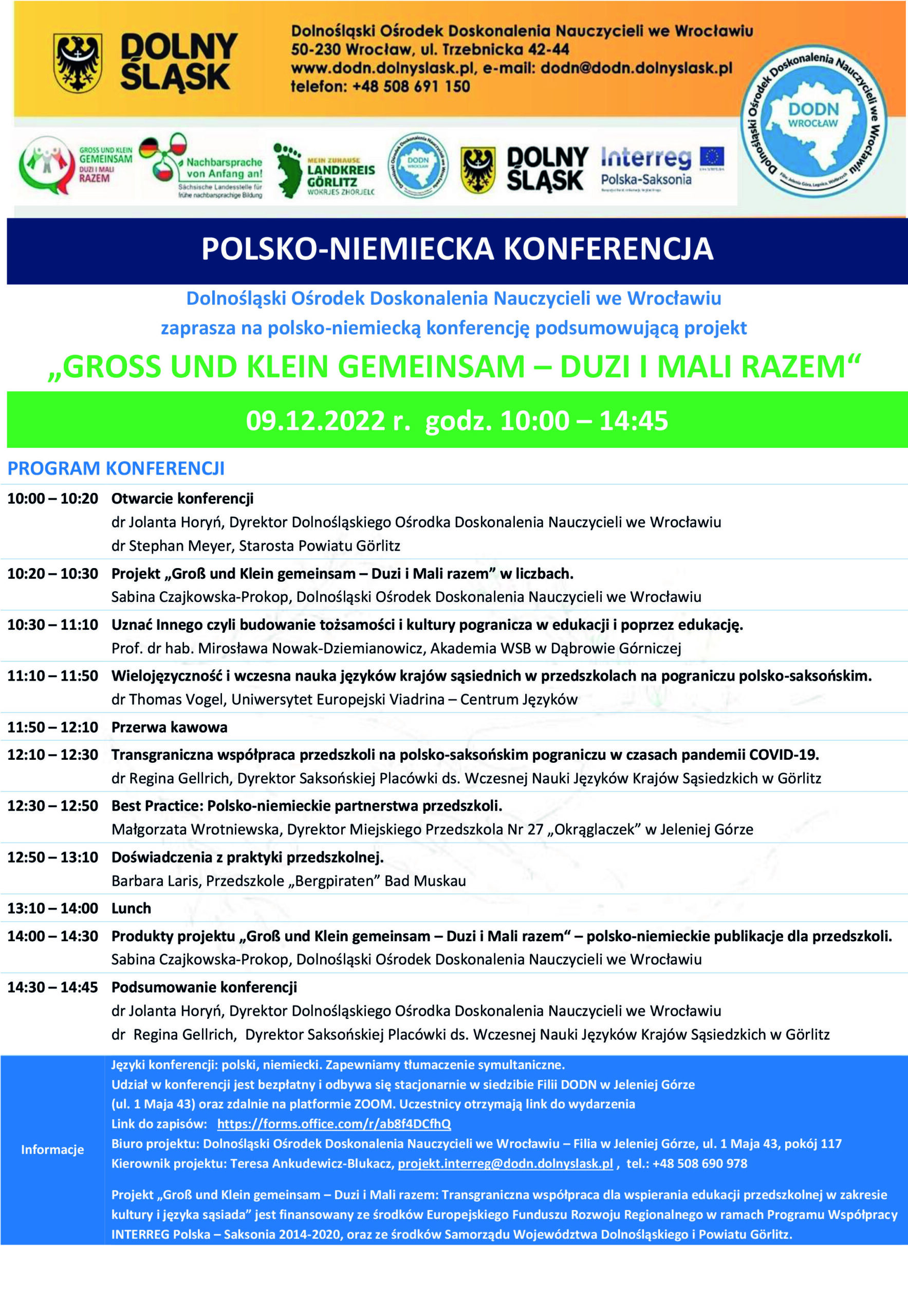 Po otwarciu konferencji przez panią dr Jolantę Horyń, Dyrektora DODN we Wrocławiu, przedstawione zostały założenia i efekty projektu. Następnie uczestnicy wysłuchali dwóch wystąpień: pani prof. dr hab. Mirosławy Nowak-Dziemianowicz pt. „Uznać Innego czyli budowanie tożsamości i kultury pogranicza w edukacji i poprzez edukację” oraz pana dr. Thomasa Vogel pt. „Wielojęzyczność i wczesna nauka języków krajów sąsiednich w przedszkolach na pograniczu polsko-saksońskim”. Po przerwie, w części dotyczącej praktycznej realizacji projektu, uczestnicy konferencji wysłuchali czterech wystąpień: „Transgraniczna współpraca przedszkoli na polsko-saksońskim pograniczu w czasach pandemii COVID-19” (dr Regina Gellrich), „Best Practice: Polsko-niemieckie partnerstwa przedszkoli” (Małgorzata Wrotniewska), „Doświadczenia z praktyki przedszkolnej” (Barbara Laris) oraz „Produkty projektu „Groß und Klein gemeinsam – Duzi i Mali razem“: polsko-niemieckie publikacje dla przedszkoli” (Sabina Czajkowska-Prokop).