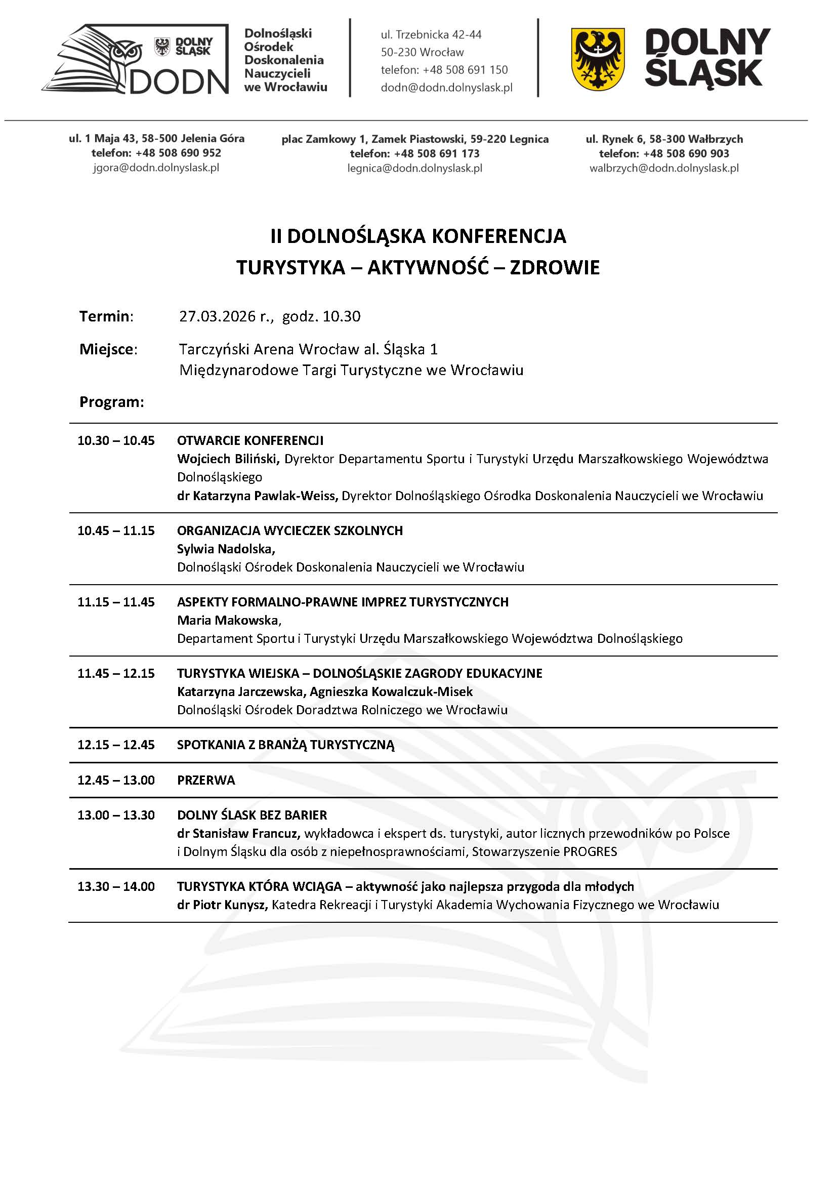 oraz Departament Sportu i Turystyki Urzędu Marszałkowskiego Województwa Dolnośląskiego zapraszają dyrektorów oraz nauczycieli przedszkoli, szkół i placówek oświatowych na II Dolnośląską Konferencję TURYSTYKA – AKTYWNOŚĆ – ZDROWIE.