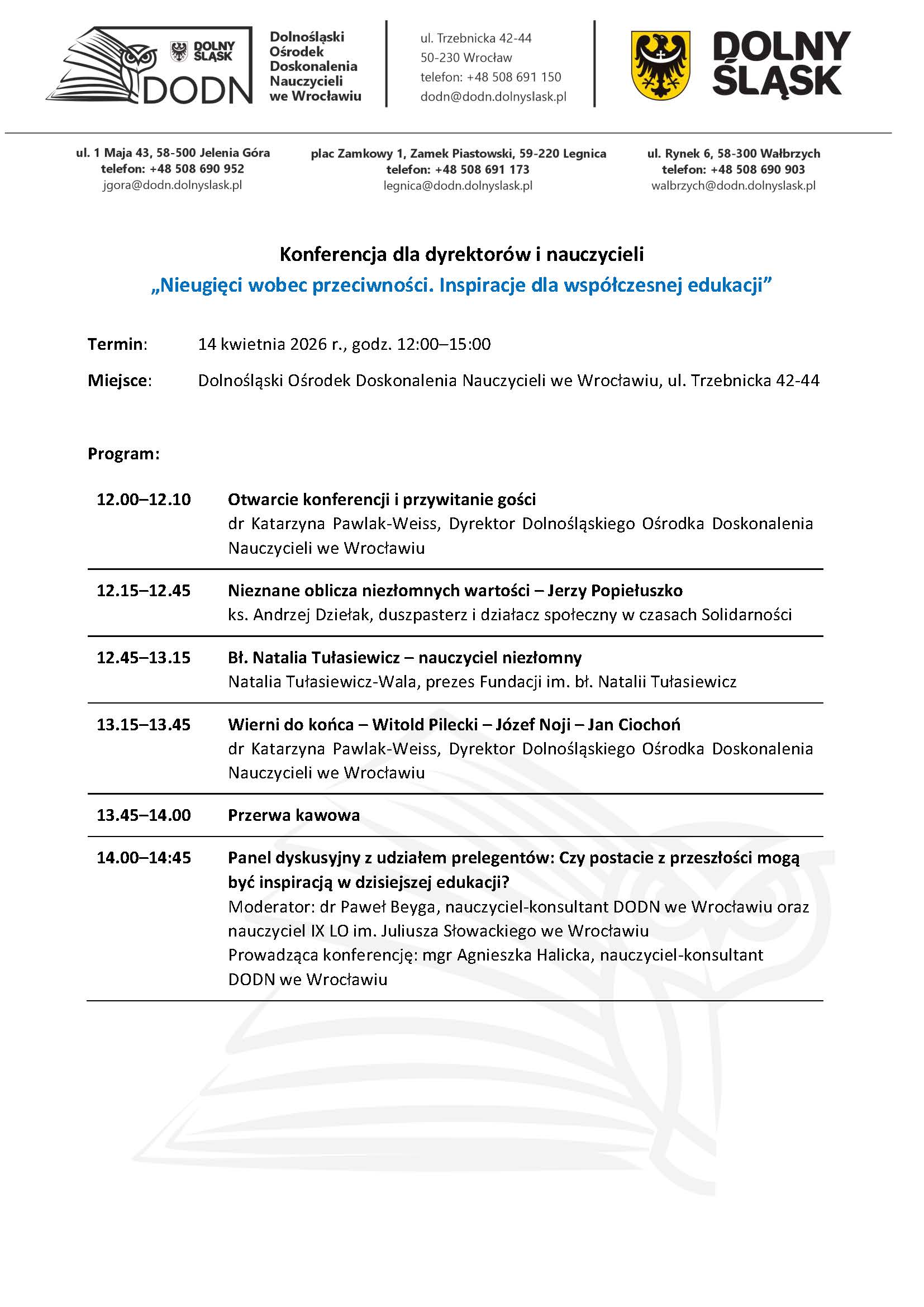 Dolnośląski Ośrodek Doskonalenia Nauczycieli we Wrocławiu serdecznie zaprasza dyrektorów szkół oraz zainteresowanych nauczycieli na bezpłatną konferencję pt. „Nieugięci wobec przeciwności. Inspiracje dla współczesnej edukacji”.