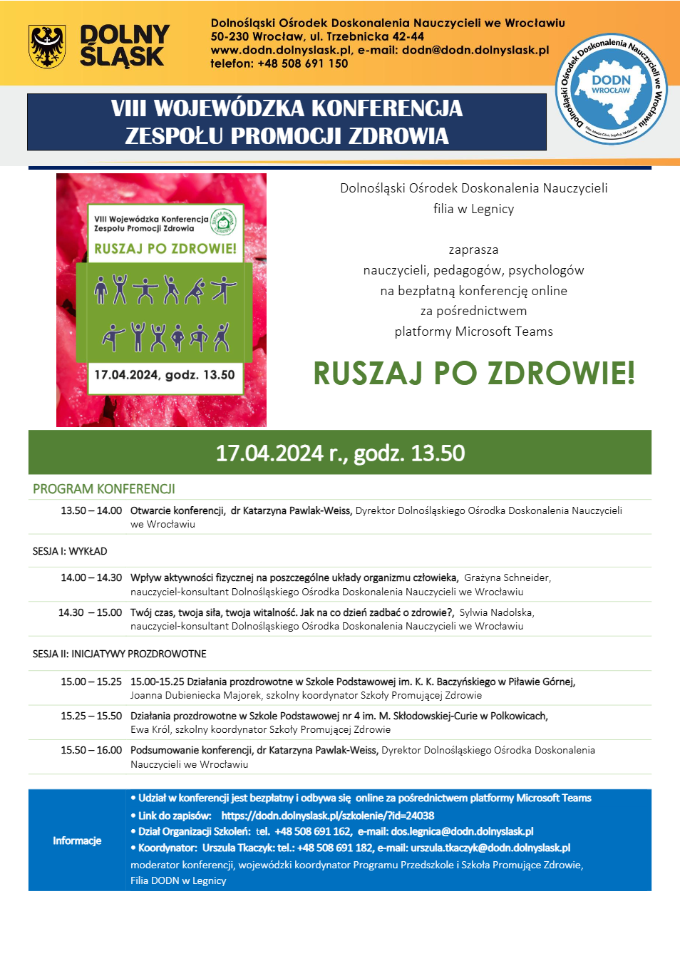 17 kwietnia 2024 r. Zespół ds. Promocji Zdrowia zorganizował dla środowiska edukacyjnego VIII Wojewódzką konferencję pt. „Ruszaj po zdrowie!” Konferencję otworzył p. Jerzy Rudnicki, Wicedyrektor DODN w Wrocławiu, wprowadzając uczestników w tematykę spotkania.