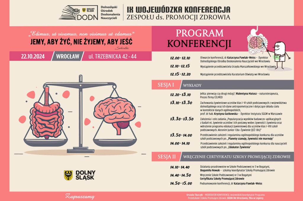 22 października 2024 r. Zespół ds. Promocji Zdrowia zorganizował dla środowiska edukacyjnego IX Wojewódzką Konferencję pt. „Jemy, aby żyć, nie żyjemy, aby jeść”. Konferencję otworzyła Pani dr Katarzyna Pawlak-Weiss, Dyrektor Dolnośląskiego Ośrodka Doskonalenia Nauczycieli we Wrocławiu.