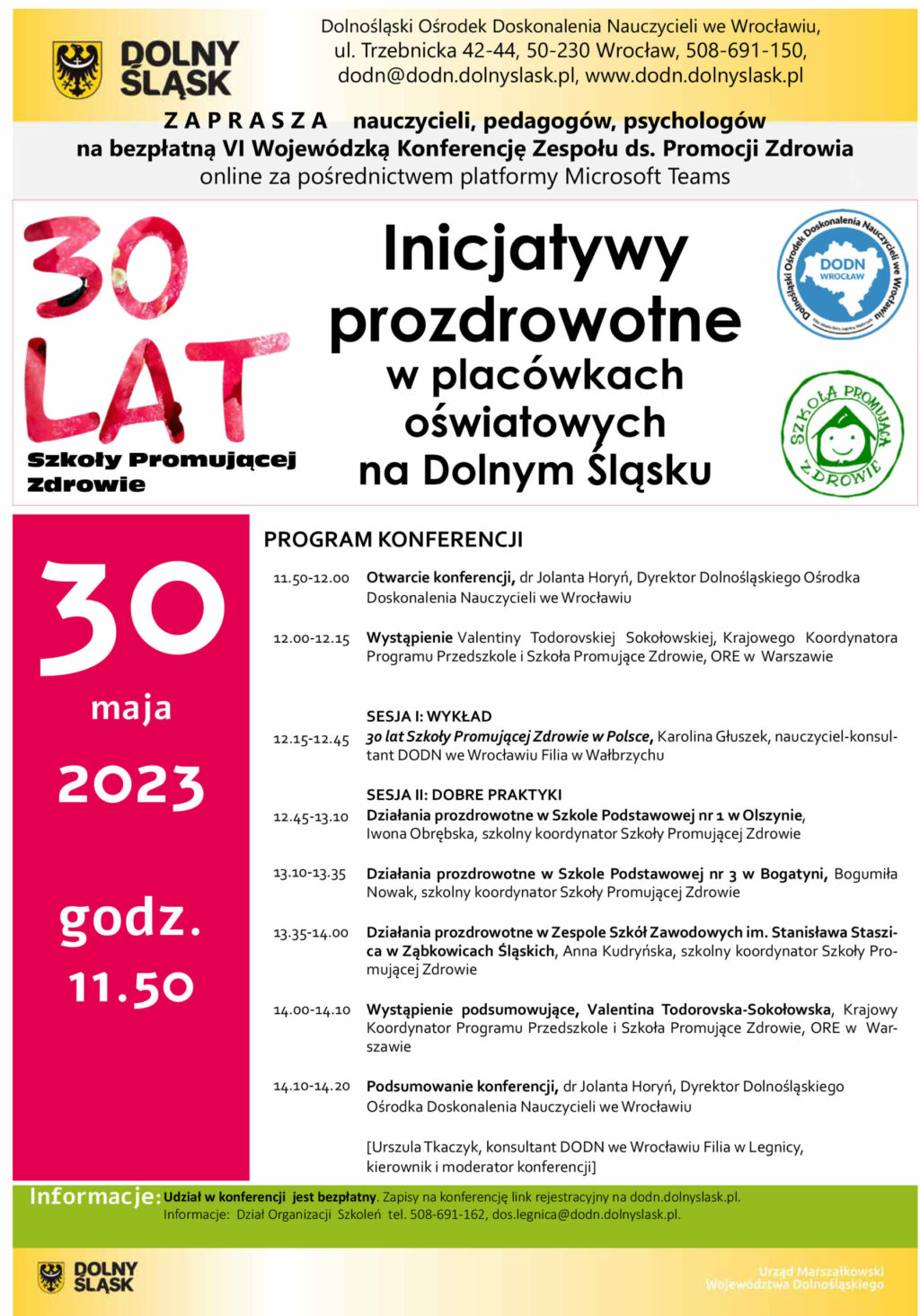 Moderatorką konferencji, dbającą o sprawny przebieg wydarzenia, była p. Urszula Tkaczyk, Wojewódzki Koordynator Szkoły Promującej Zdrowie, nauczycielka-konsultantka legnickiej filii DODN.