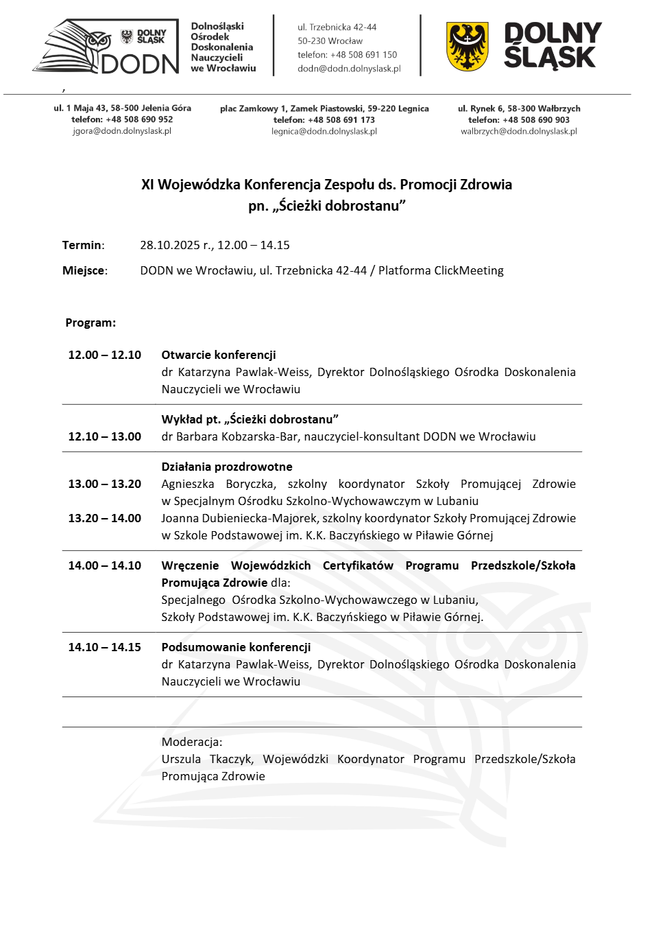 W dniu 28 października 2025 r. w Dolnośląskim Ośrodku Doskonalenia Nauczycieli we Wrocławiu odbyła się XI Wojewódzka Konferencja Zespołu ds. Promocji Zdrowia, adresowana do nauczycieli ze szkół, przedszkoli i placówek należących do Dolnośląskiej Sieci Przedszkoli i Szkół Promujących Zdrowie. Organizatorem konferencji pn. „Ścieżki dobrostanu” był Dolnośląski Ośrodek Doskonalenia Nauczycieli we Wrocławiu, a inicjatorką wydarzenia – Urszula Tkaczyk, wojewódzki koordynator Programu Przedszkole i Szkoła Promujące Zdrowie.