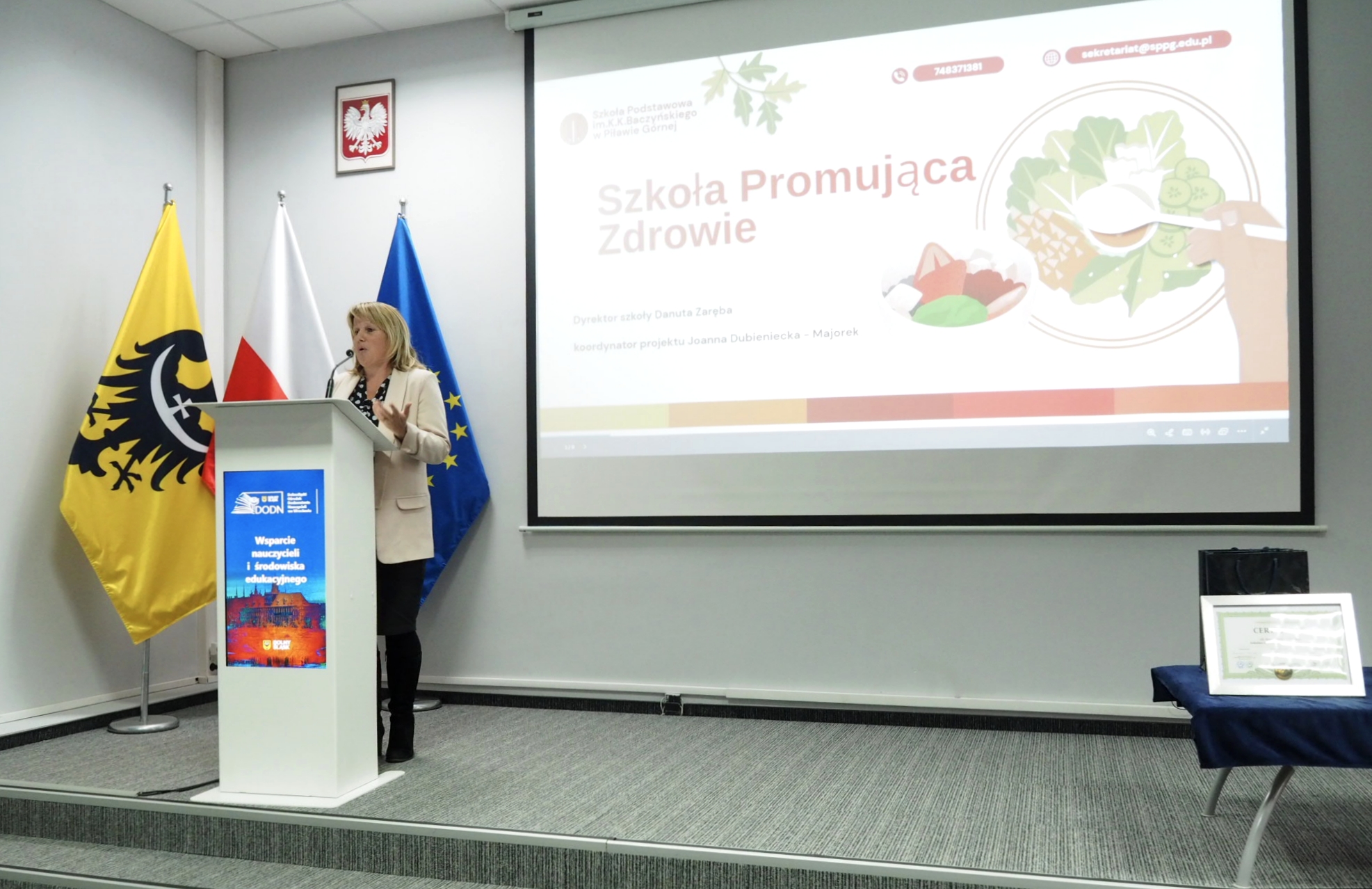 Następnie uczestnicy wysłuchali relacji z procesu ubiegania się o certyfikat przez Szkołę Podstawową im. K.K. Baczyńskiego w Piławie Górnej. Joanna Dubieniecka-Majorek, szkolny koordynator Szkoły Promującej Zdrowie, omówiła działania podejmowane w ostatnich latach, które wpłynęły na zwiększenie świadomości prozdrowotnej oraz kształtowanie zdrowych nawyków wśród uczniów, rodziców i pracowników szkoły. Wskazała również liczne sukcesy, które przyczyniły się do tworzenia bardziej przyjaznego klimatu placówki.