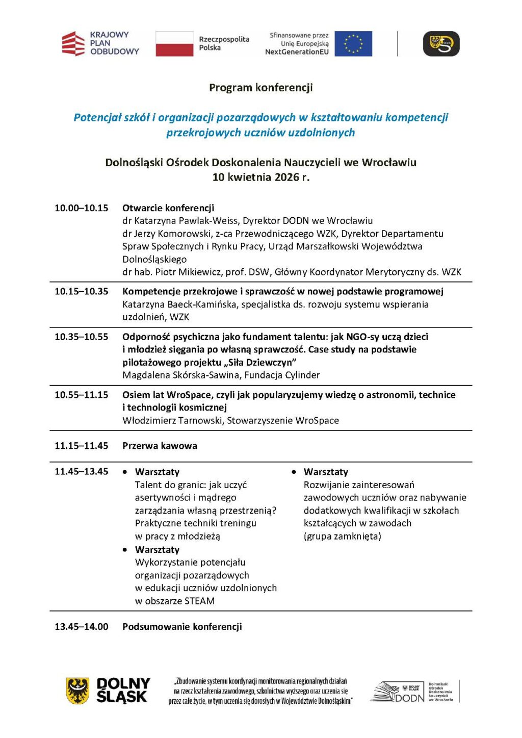 W imieniu Pana Wojciecha Bochnaka – Wicemarszałka Województwa Dolnośląskiego oraz Przewodniczącego Wojewódzkiego Zespołu Koordynacji – serdecznie zapraszamy nauczycieli oraz przedstawicieli organizacji pozarządowych działających na rzecz rozwoju umiejętności dzieci i młodzieży na konferencję „Potencjał szkół i organizacji pozarządowych w kształtowaniu kompetencji przekrojowych uczniów uzdolnionych”, która odbędzie się 10 kwietnia 2026 r. w godz. 10.00–14.00 w Dolnośląskim Ośrodku Doskonalenia Nauczycieli we Wrocławiu, ul. Trzebnicka 42–44.