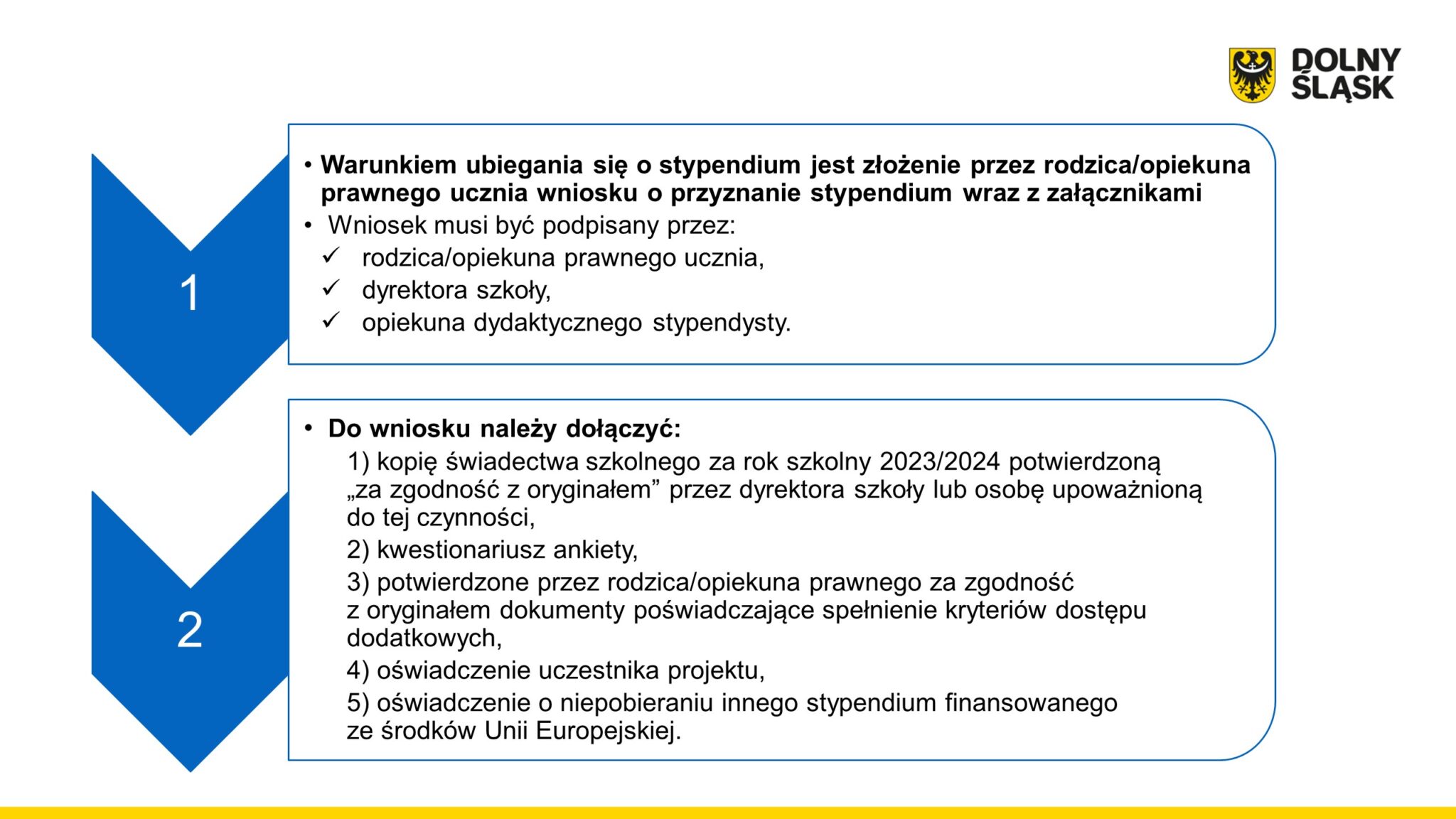 „Zarząd Województwa Dolnośląskiego w dniu 14.10.2024 r. podjął uchwałę nr 809/VII/24 dotyczącą wydłużenia terminu naboru wniosków o przyznanie pomocy stypendialnej na lata szkolne 2024/2025 oraz 2025/2026 w ramach Dolnośląskiego Programu Stypendialnego dla uczniów szczególnie uzdolnionych w zakresie przedmiotów ścisłych i zagrożonych wykluczeniem społecznym, w ramach Programu Fundusze Europejskie dla Dolnego Śląska 2021-2027, Priorytet 8 Fundusze Europejskie dla edukacji na Dolnym Śląsku, Działanie 8.1 Dostęp do edukacji.