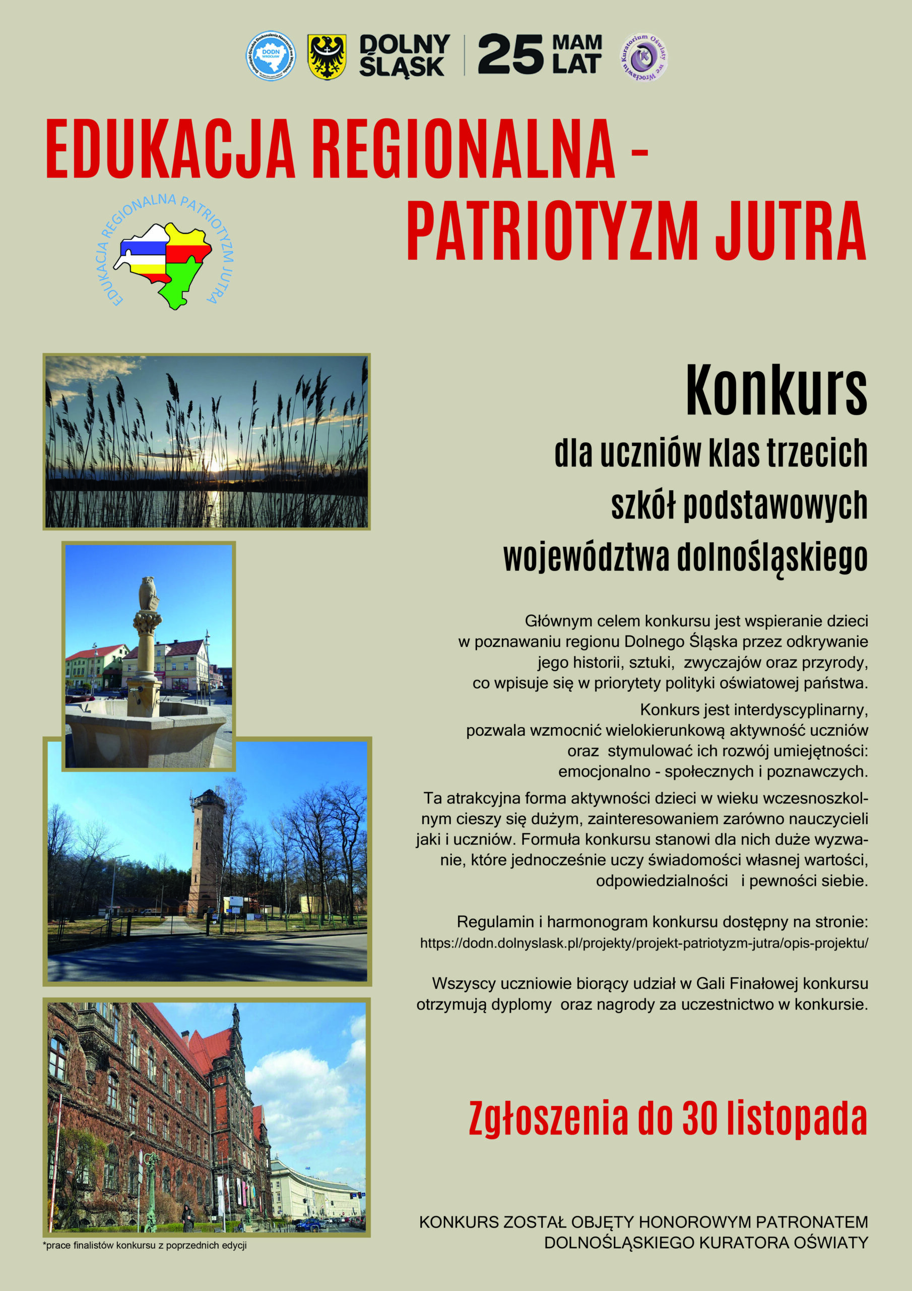 Edukacja Regionalna – Patriotyzm Jutra jest konkursem adresowanym do uczniów klas trzecich edukacji wczesnoszkolnej. Jego nadrzędnym celem jest umożliwienie poznania dzieciom regionu przez odkrywanie jego historii, sztuki, zwyczajów i przyrody. Konkurs jest interdyscyplinarny, pozwala na wspieranie wielokierunkowej aktywności ucznia oraz na stymulację jego rozwoju w obszarze emocjonalnym, społecznym i poznawczym. W konkursie proponuje się wykorzystanie fotografii jako dokumentu świadectwa miejsc, historii i tradycji osób zamieszkujących różne regiony Dolnego Śląska. Ważnym celem tego konkursu – oprócz poznania wielowiekowej spuścizny własnego rejonu – jest także kształtowanie umiejętności pracy zespołowej oraz przekazywania zdobytych wiadomości rówieśnikom z innych miejscowości województwa dolnośląskiego.