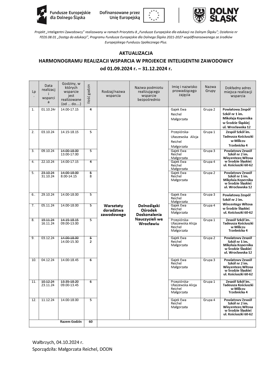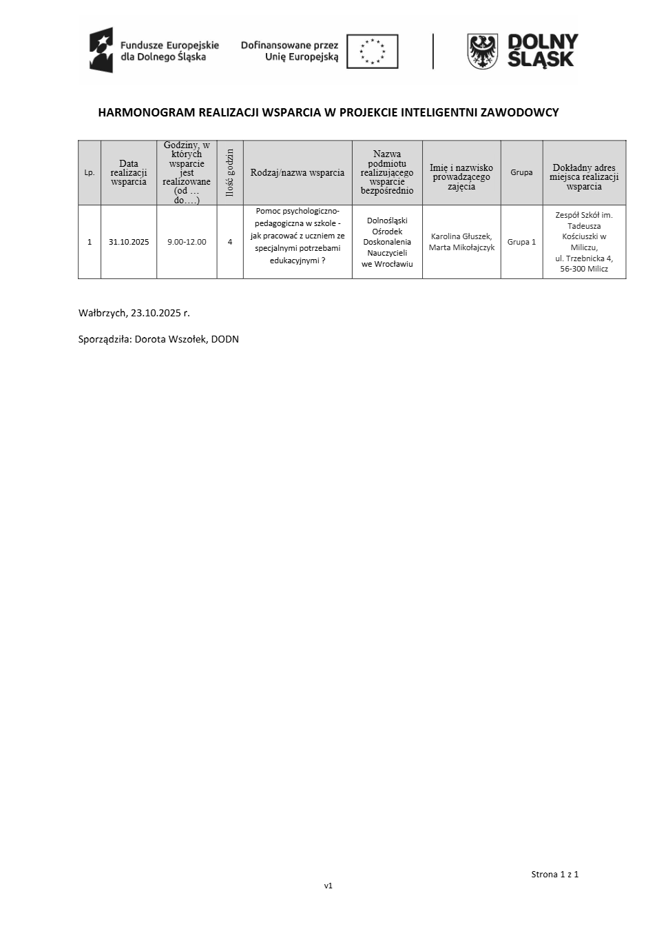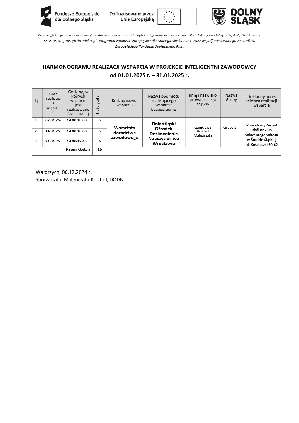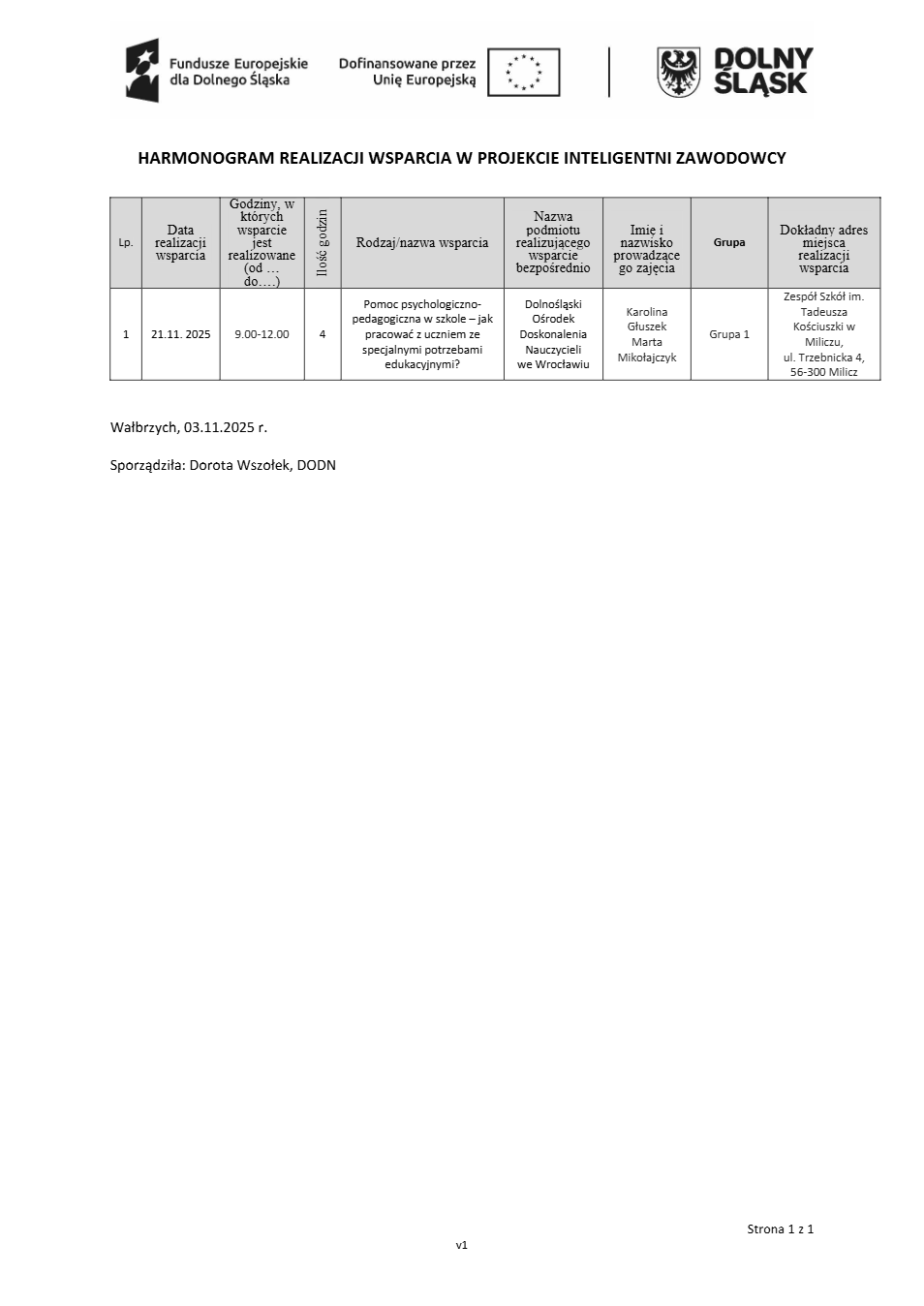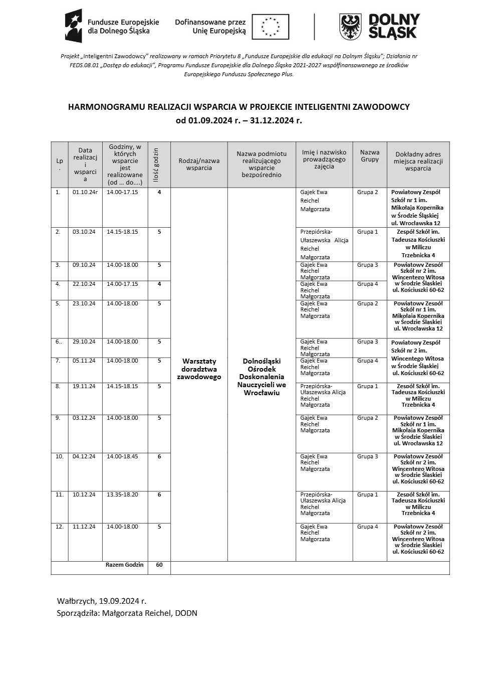 Projekt „Inteligentni Zawodowcy” realizowany w ramach Priorytetu 8 „Fundusze Europejskie dla edukacji na Dolnym Śląsku”; Działania nr FEDS.08.01 „Dostęp do edukacji”, Programu Fundusze Europejskie dla Dolnego Śląska 2021-2027 współfinansowanego ze środków Europejskiego Funduszu Społecznego Plus.
