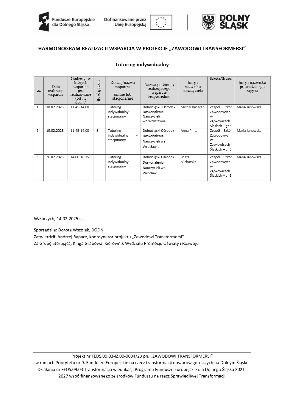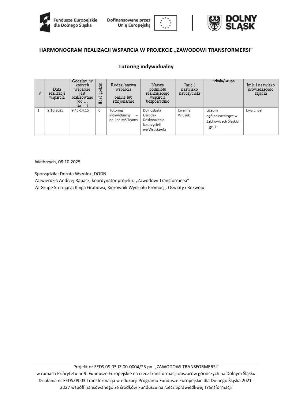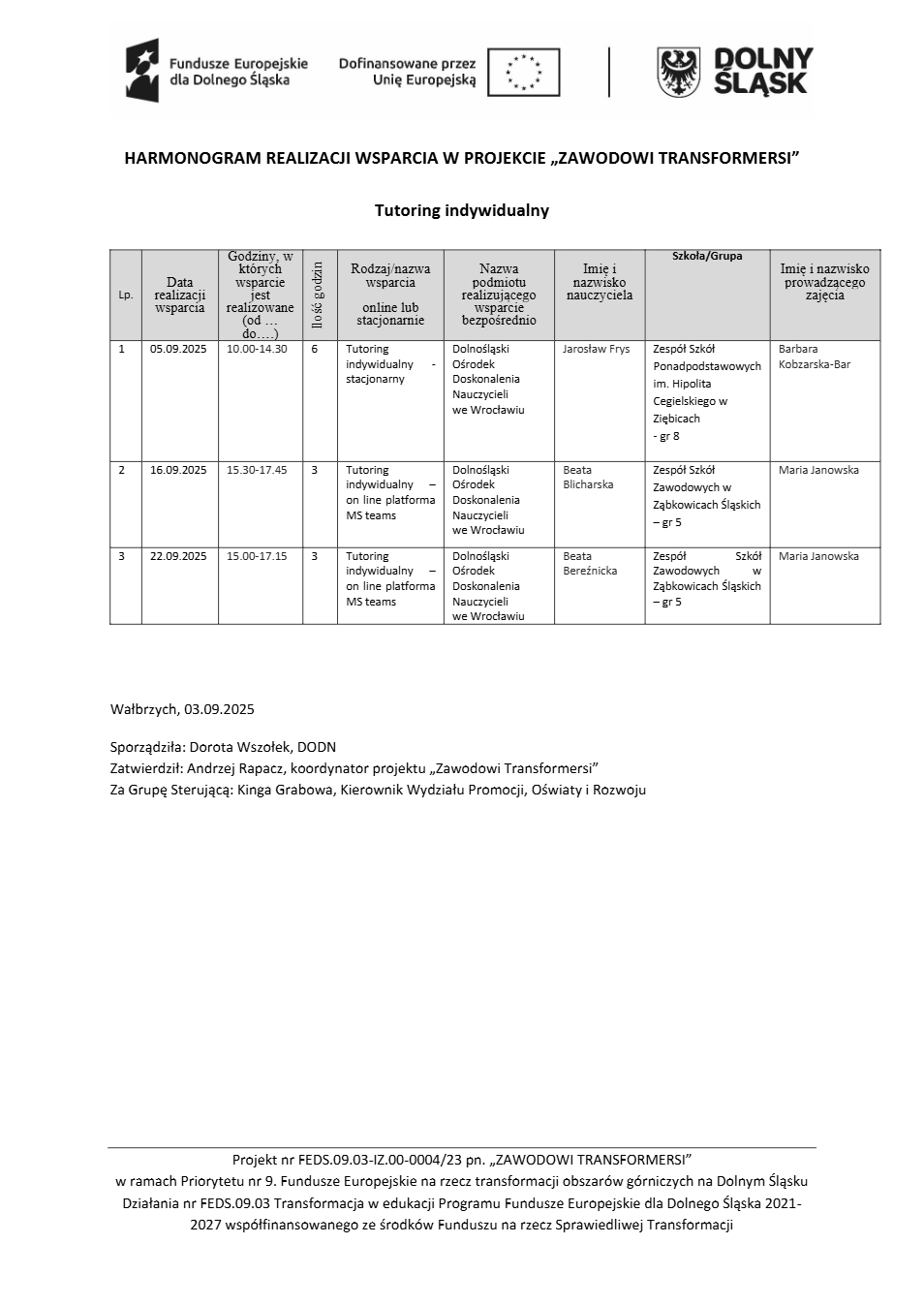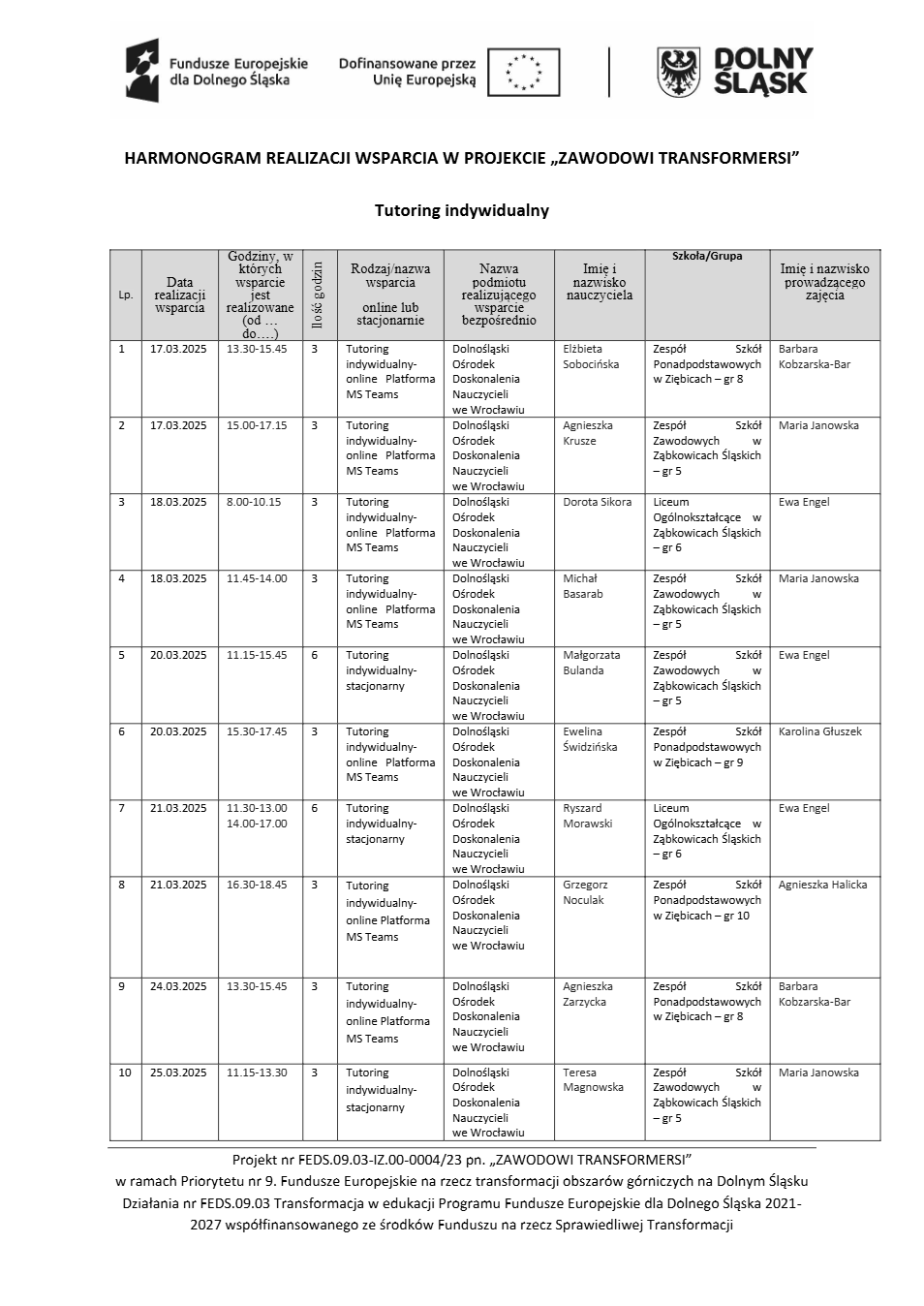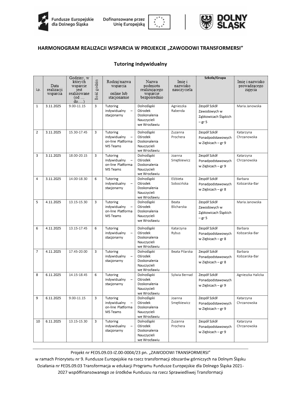 Projekt Zawodowi transformersi realizowany w ramach Priorytetu 9 „Fundusze Europejskie na rzecz transformacji obszarów górniczych na Dolnym Śląsku”, Działanie FEDS.09.03 Transformacja w edukacji, Programu Fundusze Europejskie dla Dolnego Śląska 2021 – 2027 spółfinansowanego ze środków Funduszu na rzecz Sprawiedliwej Transformacji.