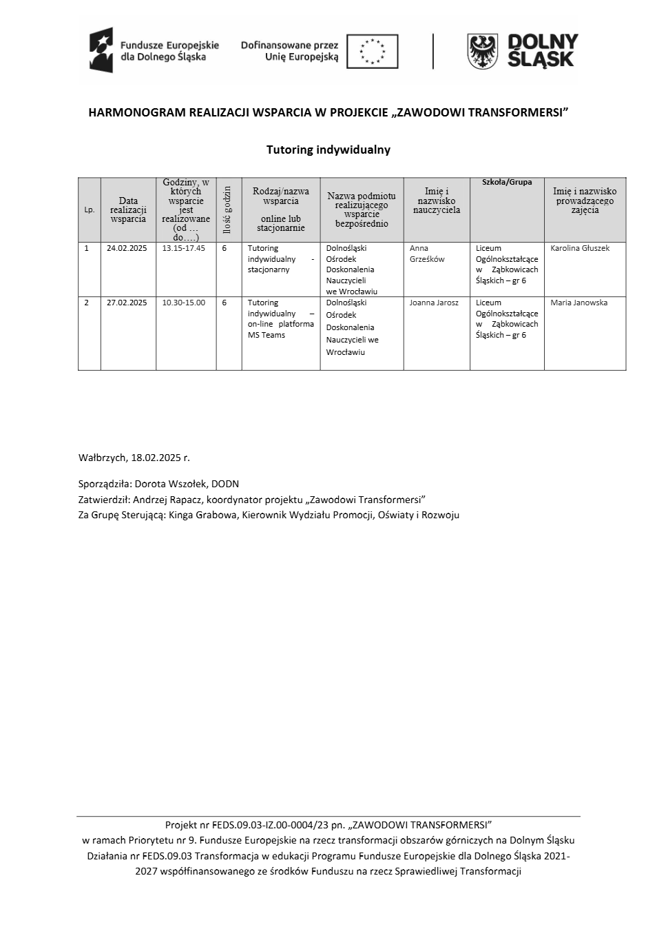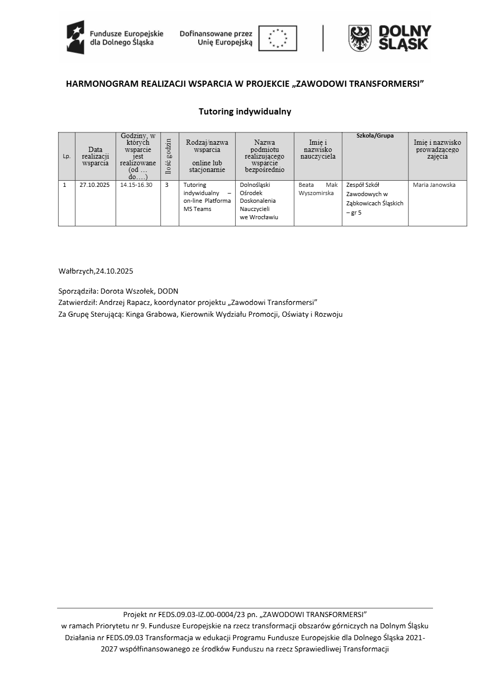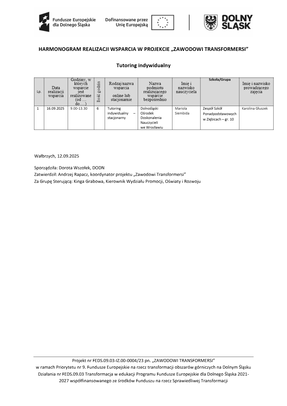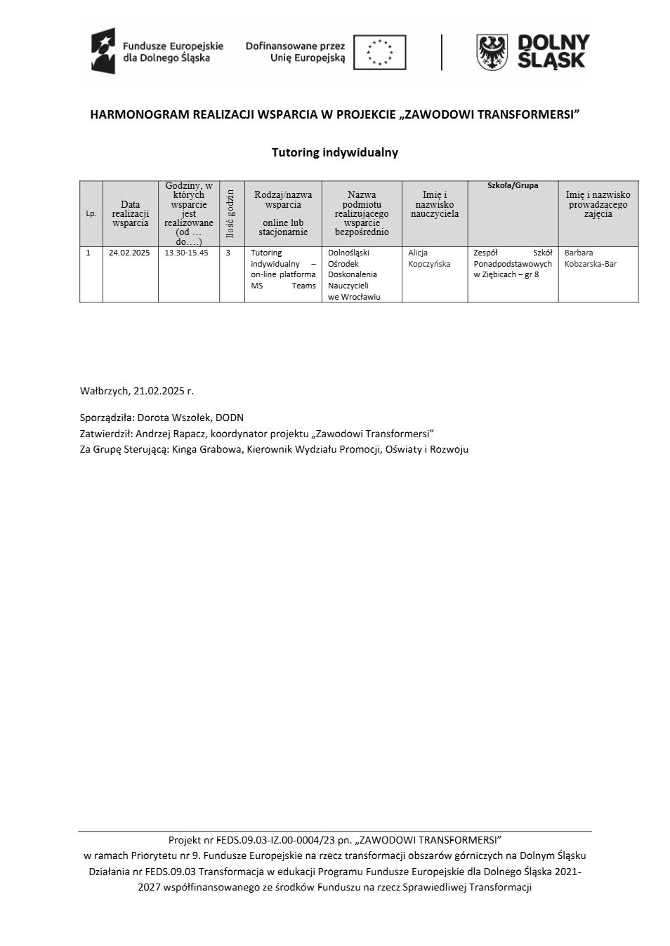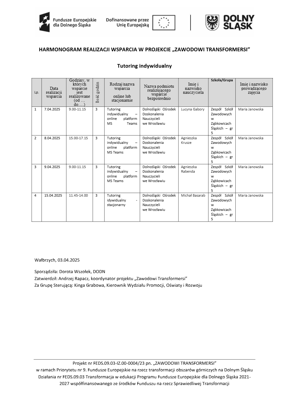 Projekt Zawodowi transformersi realizowany w ramach Priorytetu 9 „Fundusze Europejskie na rzecz transformacji obszarów górniczych na Dolnym Śląsku”, Działanie FEDS.09.03 Transformacja w edukacji, Programu Fundusze Europejskie dla Dolnego Śląska 2021 – 2027 spółfinansowanego ze środków Funduszu na rzecz Sprawiedliwej Transformacji.