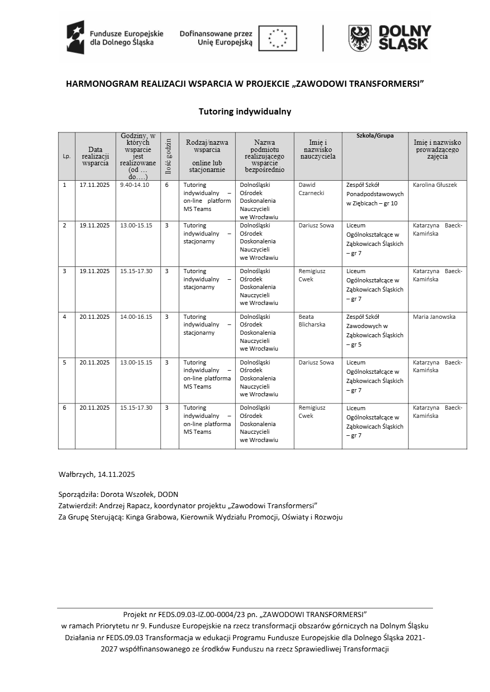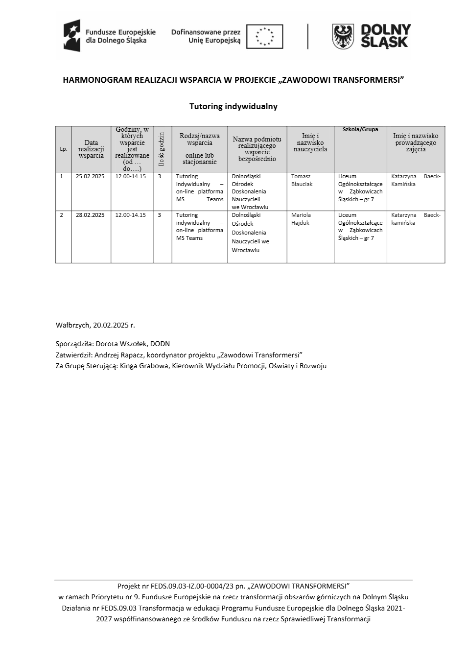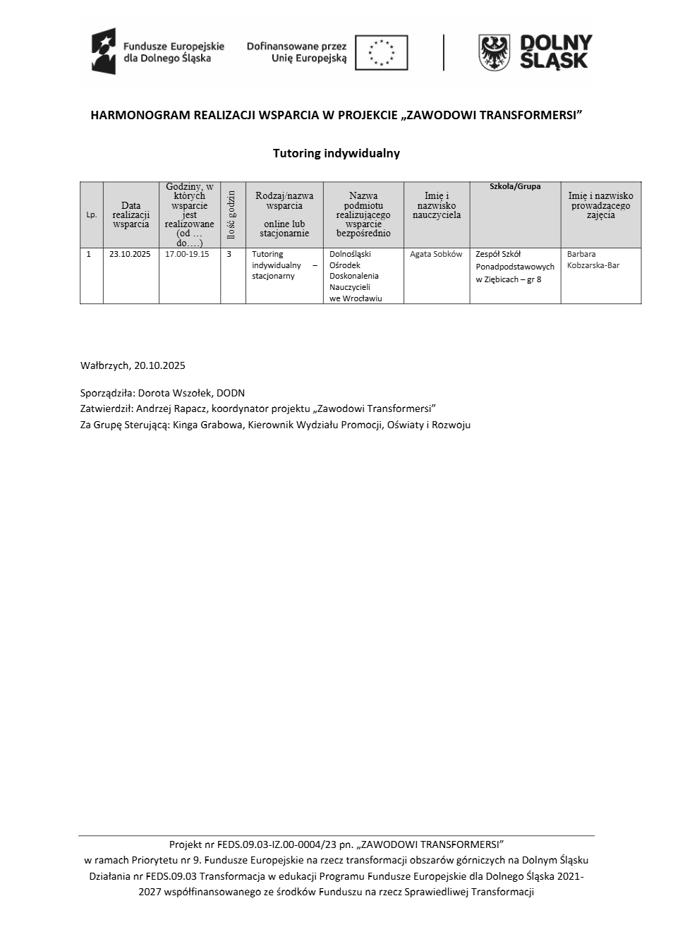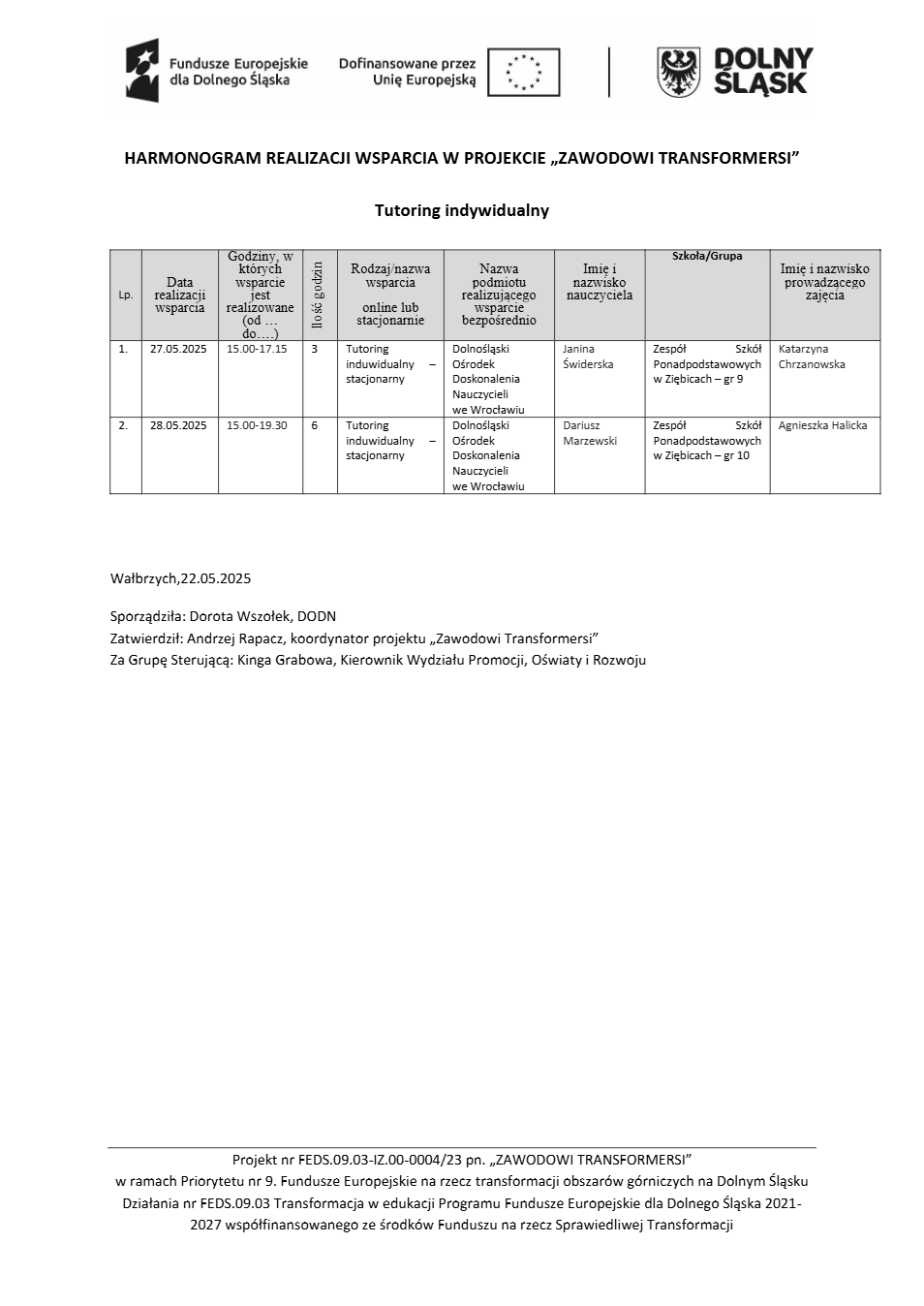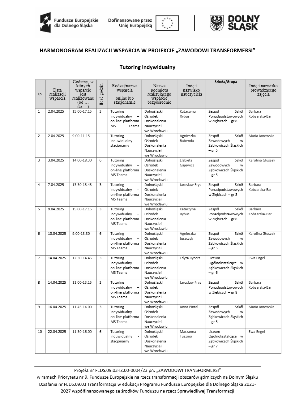 Projekt Zawodowi transformersi realizowany w ramach Priorytetu 9 „Fundusze Europejskie na rzecz transformacji obszarów górniczych na Dolnym Śląsku”, Działanie FEDS.09.03 Transformacja w edukacji, Programu Fundusze Europejskie dla Dolnego Śląska 2021 – 2027 spółfinansowanego ze środków Funduszu na rzecz Sprawiedliwej Transformacji.