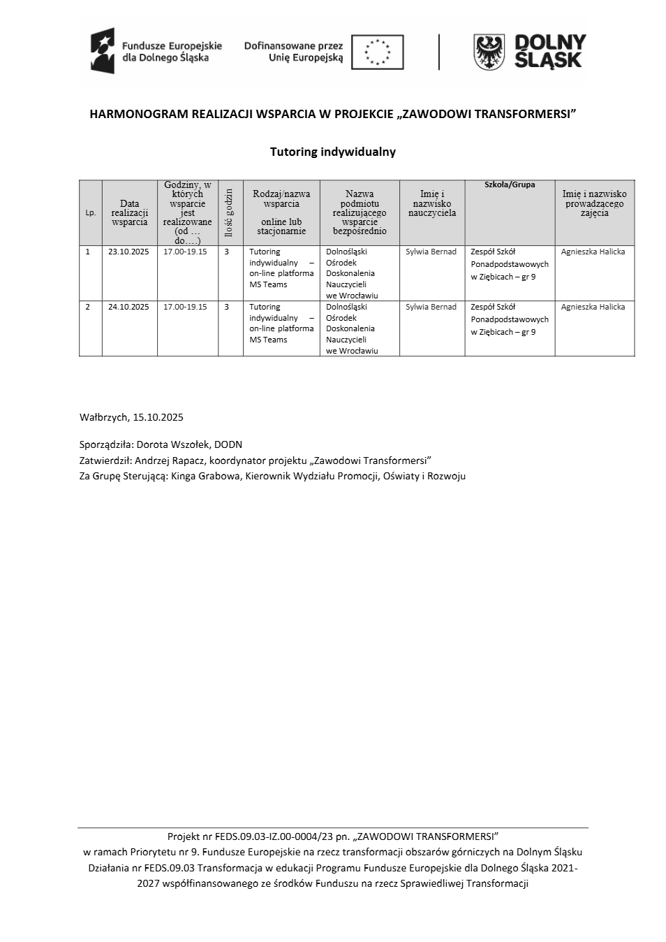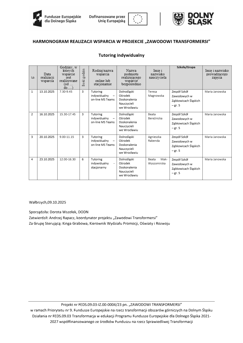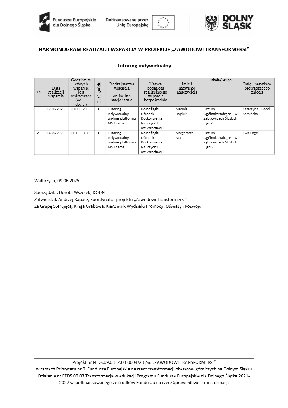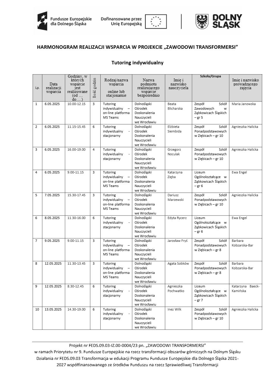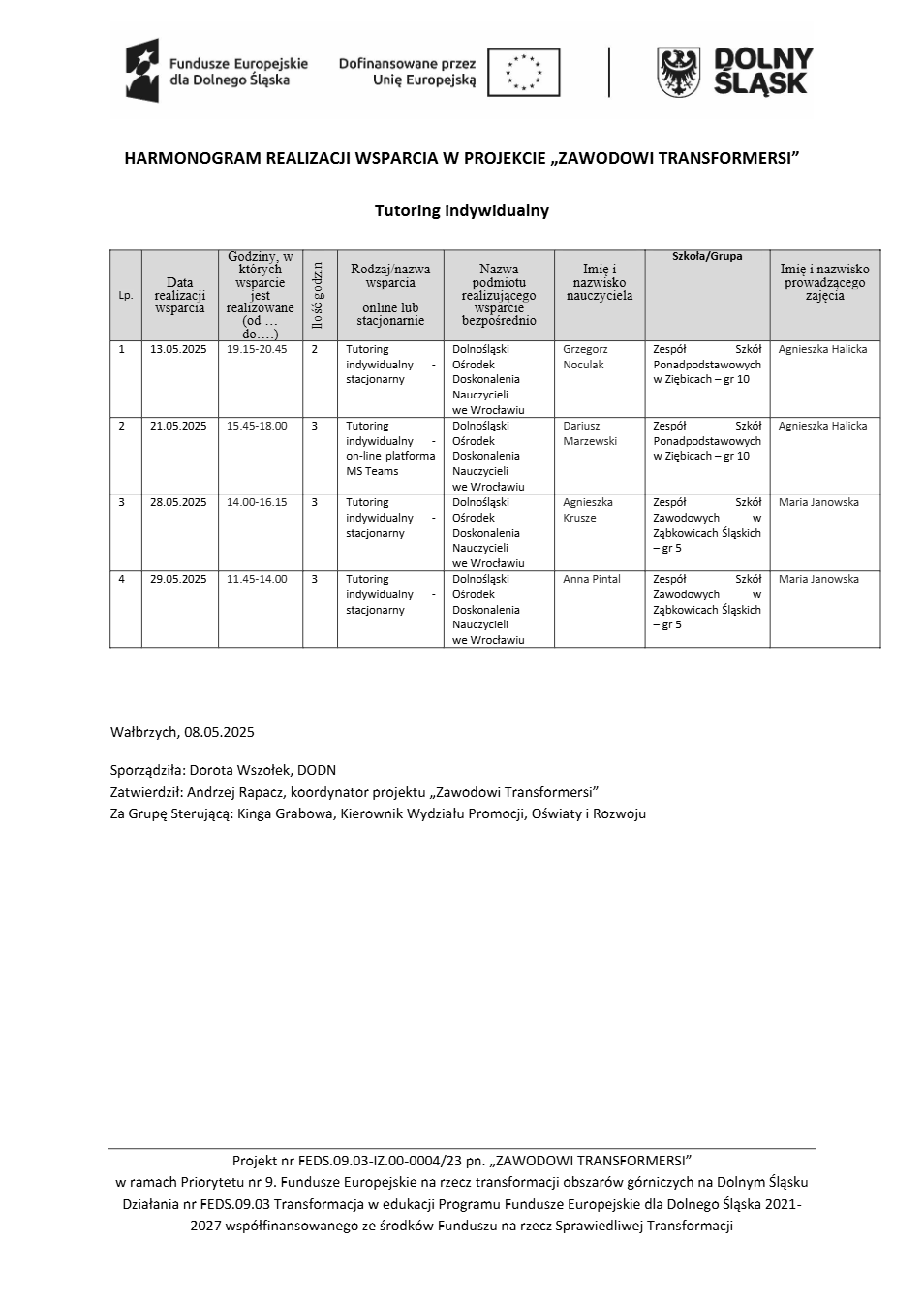 Projekt Zawodowi transformersi realizowany w ramach Priorytetu 9 „Fundusze Europejskie na rzecz transformacji obszarów górniczych na Dolnym Śląsku”, Działanie FEDS.09.03 Transformacja w edukacji, Programu Fundusze Europejskie dla Dolnego Śląska 2021 – 2027 spółfinansowanego ze środków Funduszu na rzecz Sprawiedliwej Transformacji.