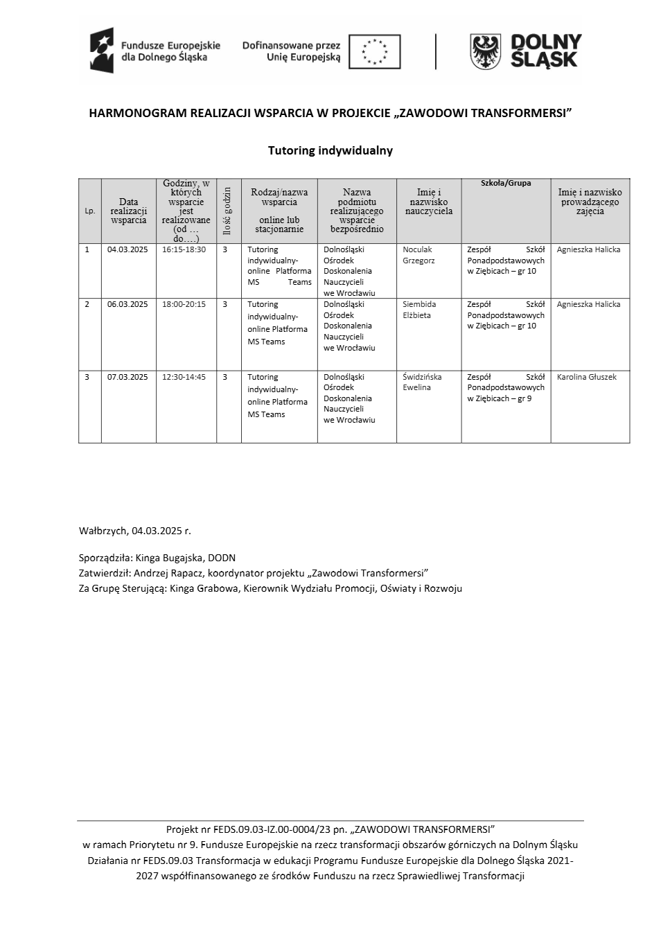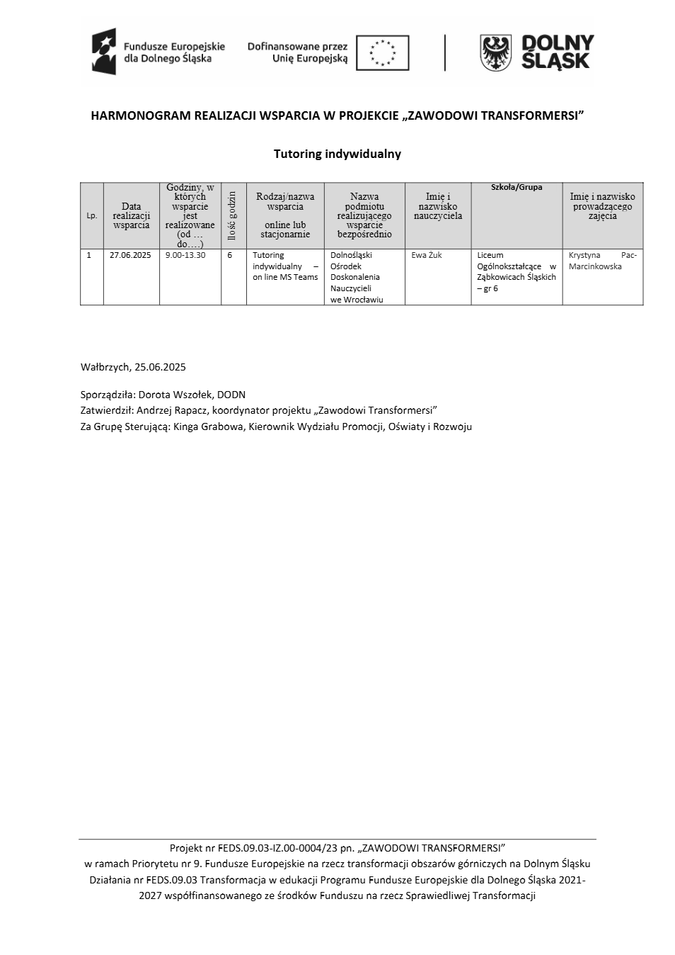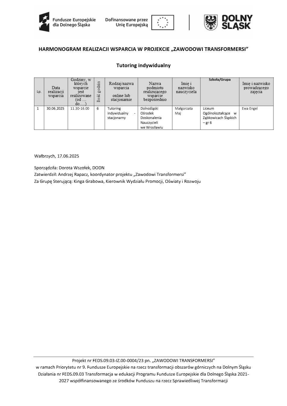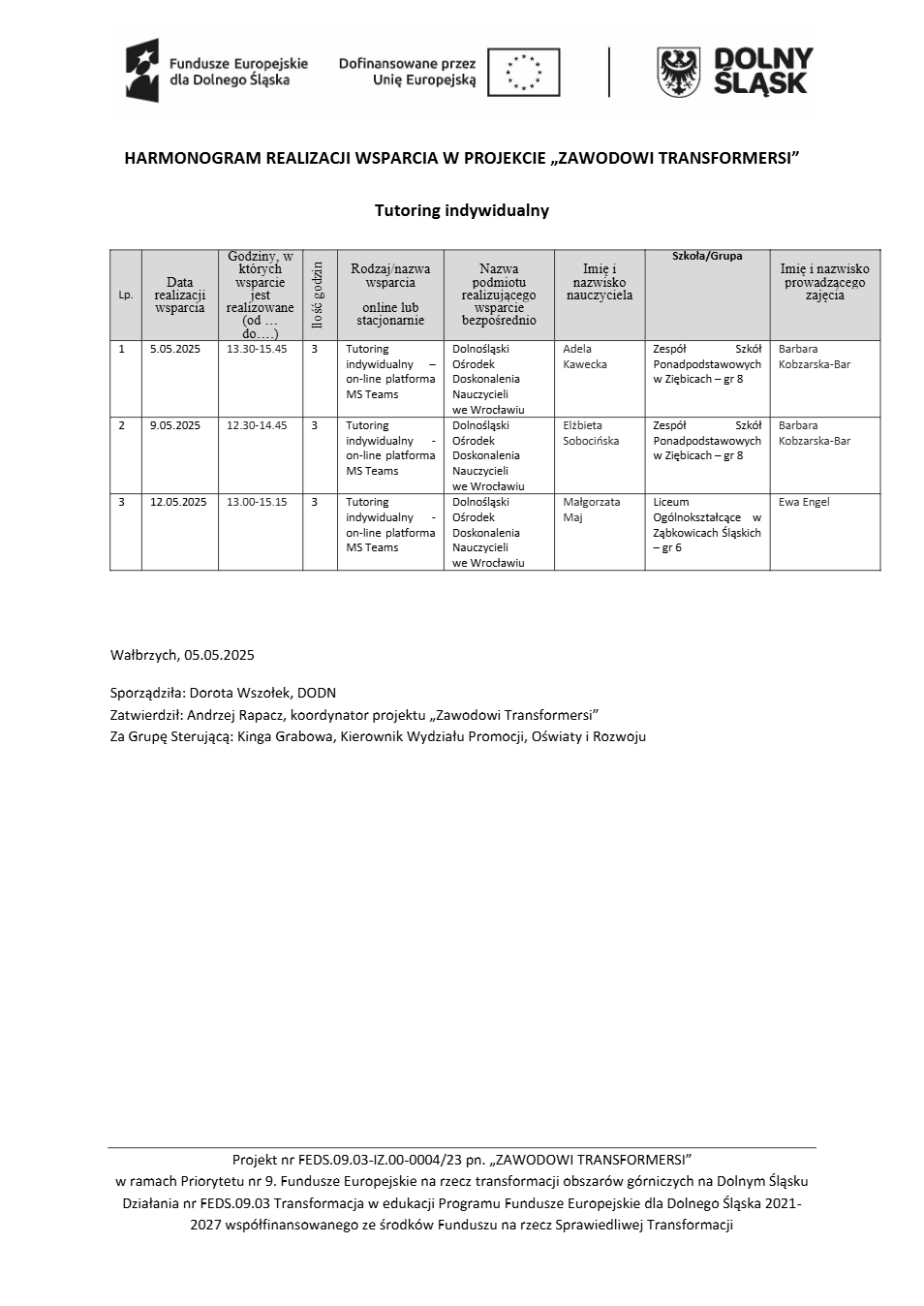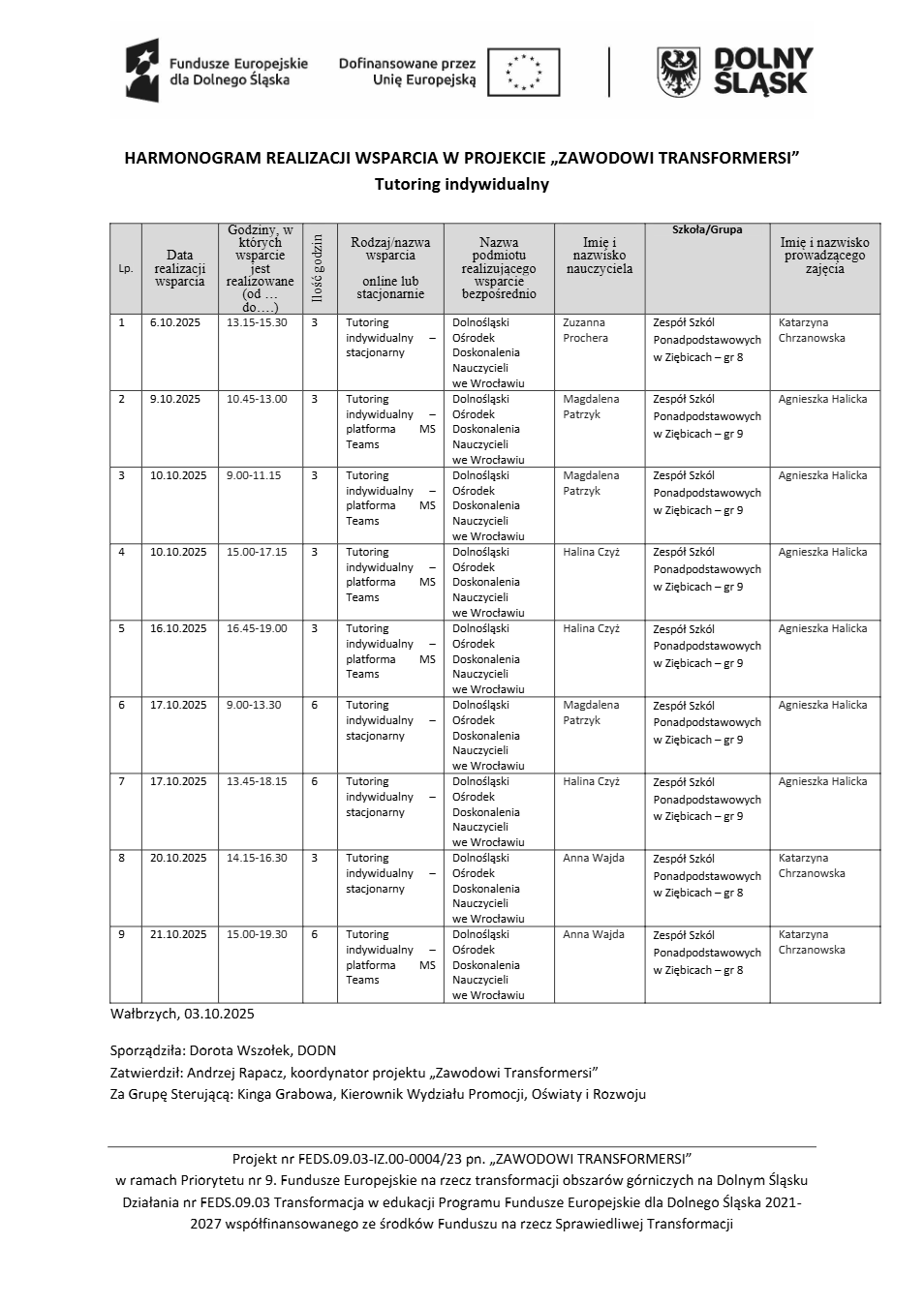 Projekt Zawodowi transformersi realizowany w ramach Priorytetu 9 „Fundusze Europejskie na rzecz transformacji obszarów górniczych na Dolnym Śląsku”, Działanie FEDS.09.03 Transformacja w edukacji, Programu Fundusze Europejskie dla Dolnego Śląska 2021 – 2027 spółfinansowanego ze środków Funduszu na rzecz Sprawiedliwej Transformacji.