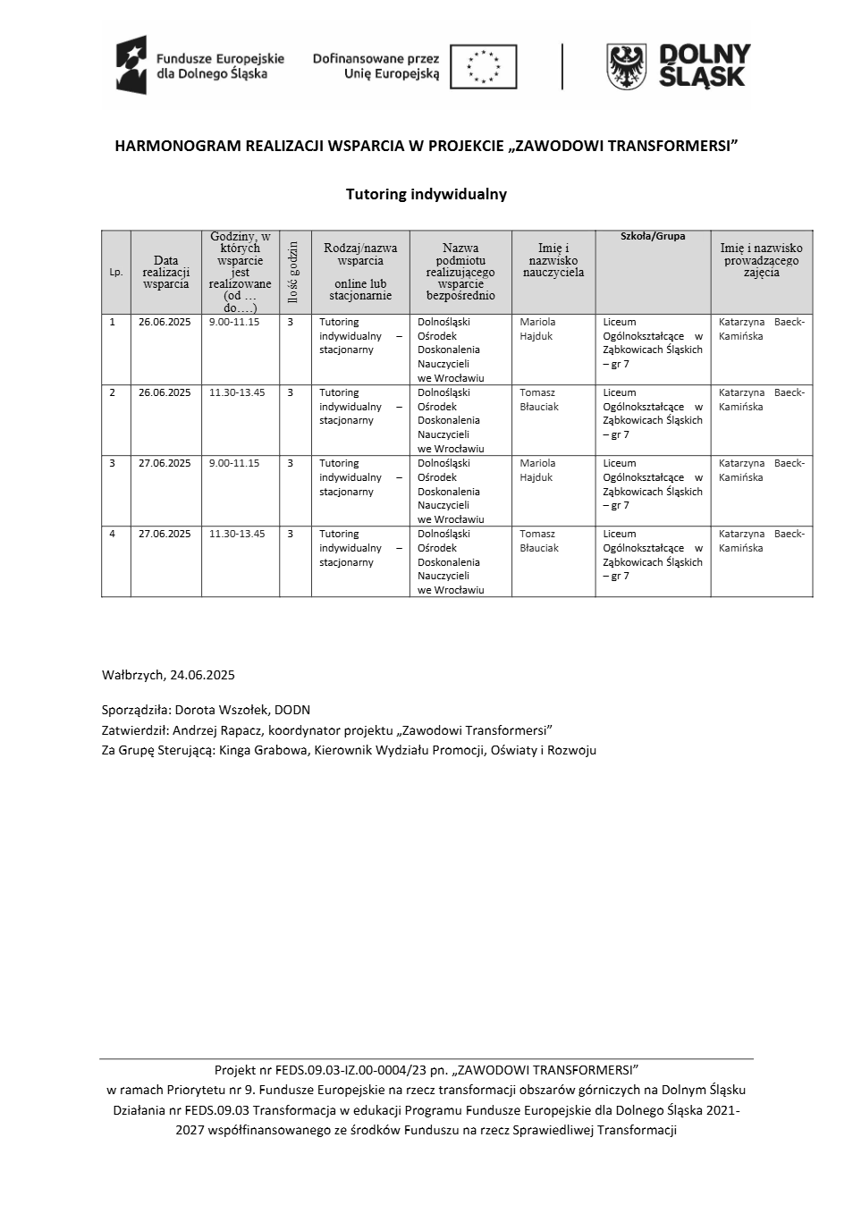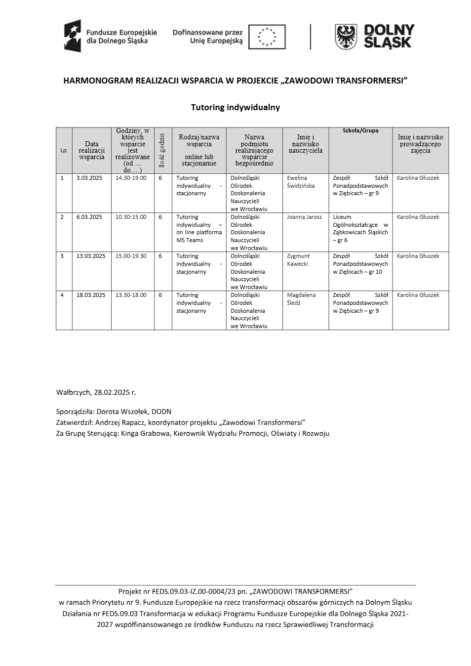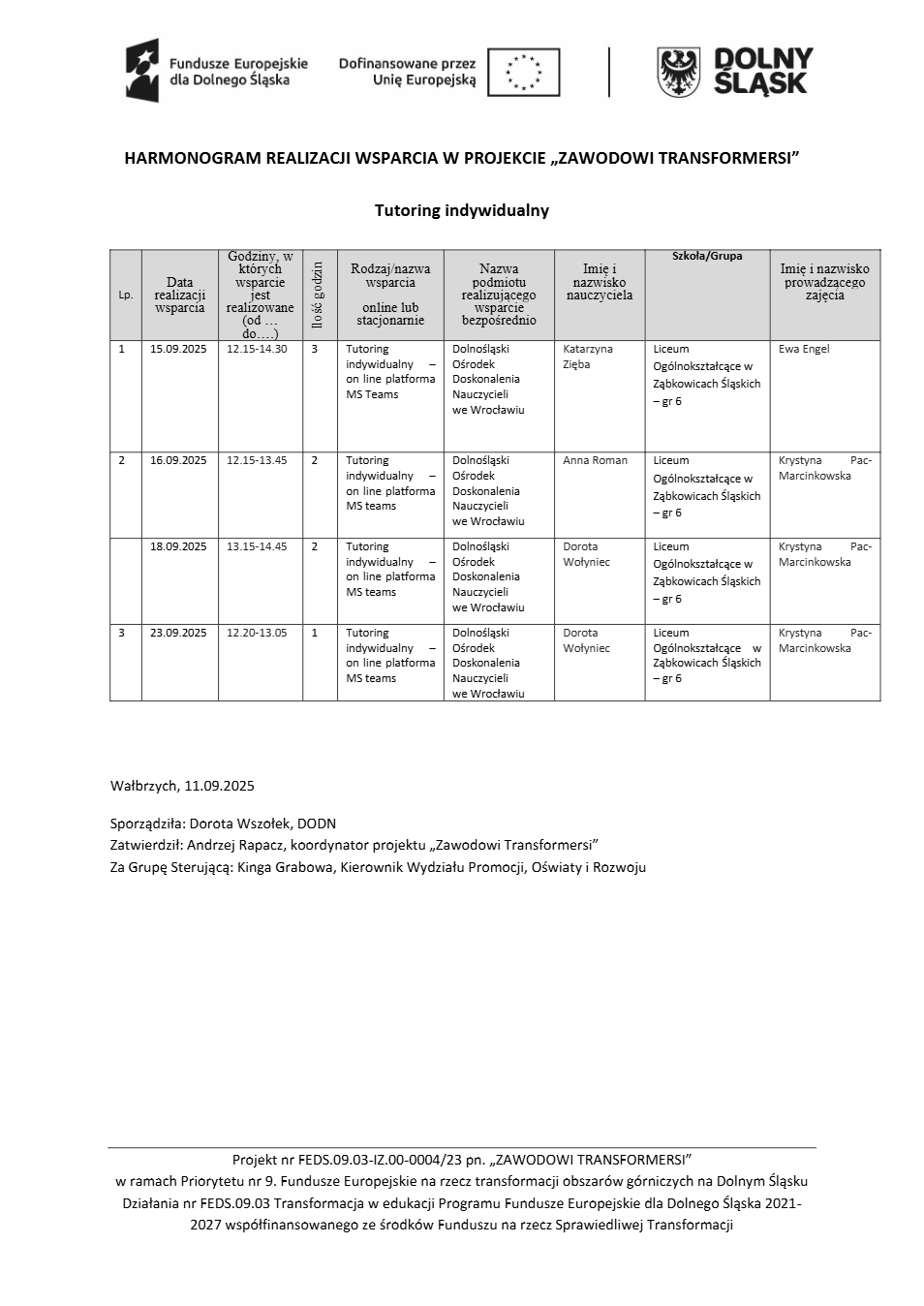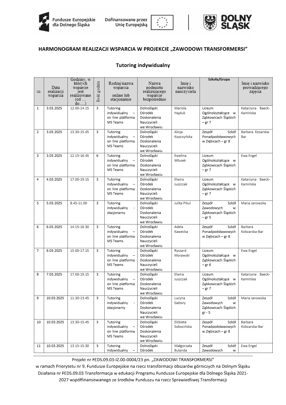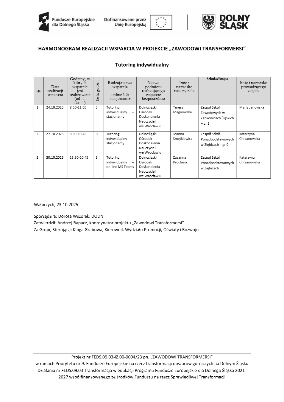 Projekt Zawodowi transformersi realizowany w ramach Priorytetu 9 „Fundusze Europejskie na rzecz transformacji obszarów górniczych na Dolnym Śląsku”, Działanie FEDS.09.03 Transformacja w edukacji, Programu Fundusze Europejskie dla Dolnego Śląska 2021 – 2027 spółfinansowanego ze środków Funduszu na rzecz Sprawiedliwej Transformacji.