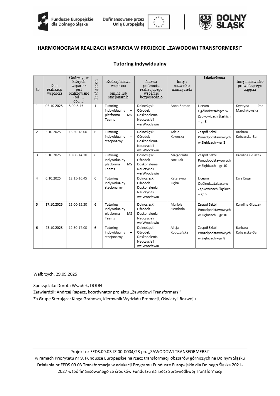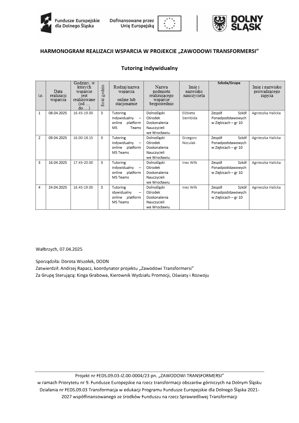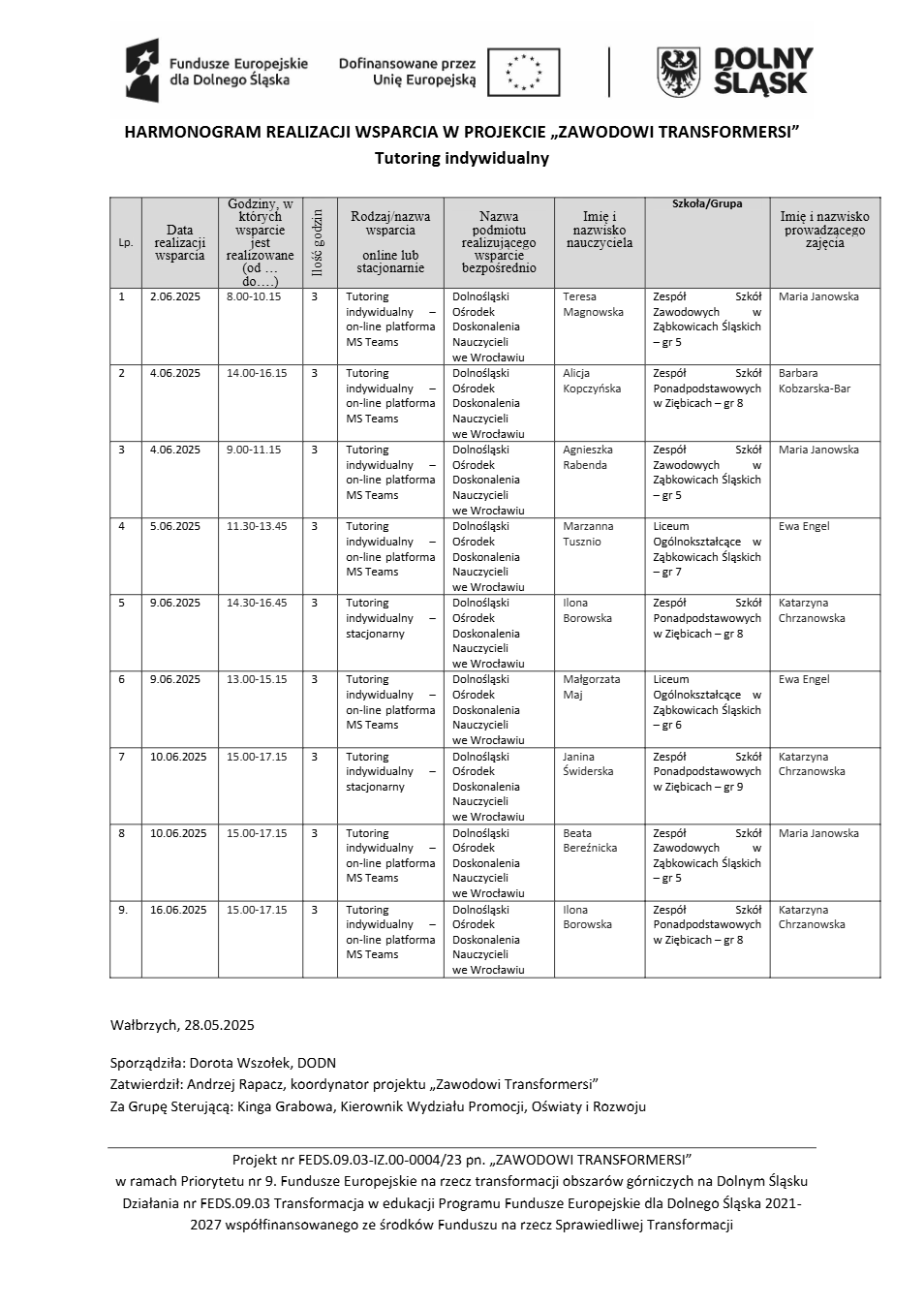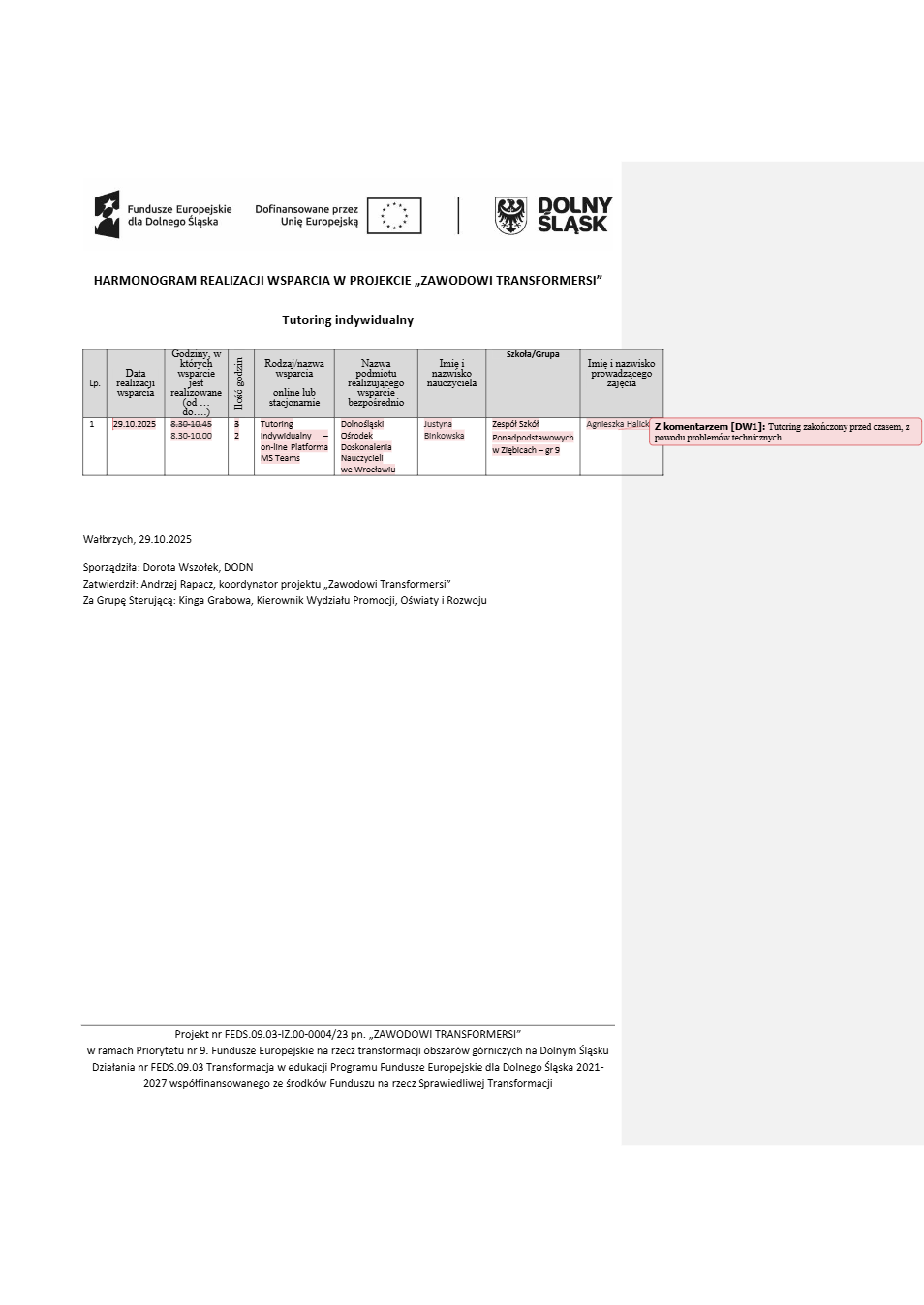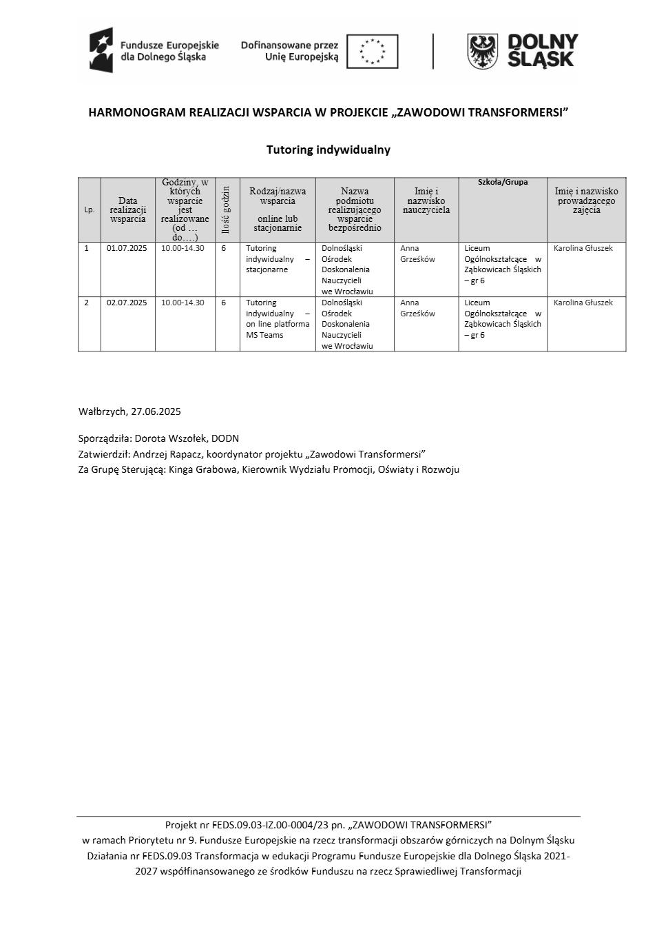 Projekt Zawodowi transformersi realizowany w ramach Priorytetu 9 „Fundusze Europejskie na rzecz transformacji obszarów górniczych na Dolnym Śląsku”, Działanie FEDS.09.03 Transformacja w edukacji, Programu Fundusze Europejskie dla Dolnego Śląska 2021 – 2027 spółfinansowanego ze środków Funduszu na rzecz Sprawiedliwej Transformacji.