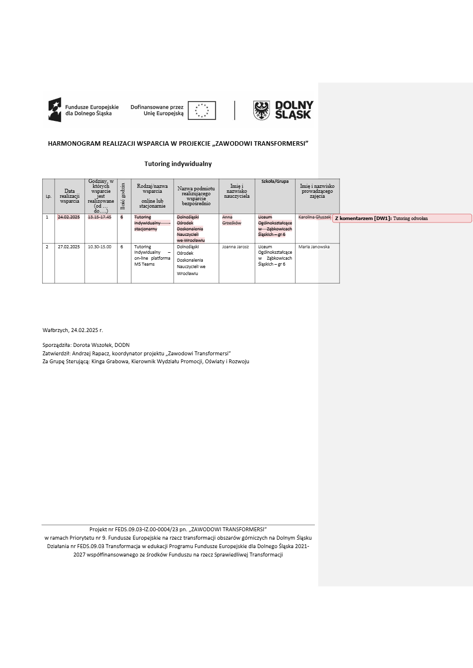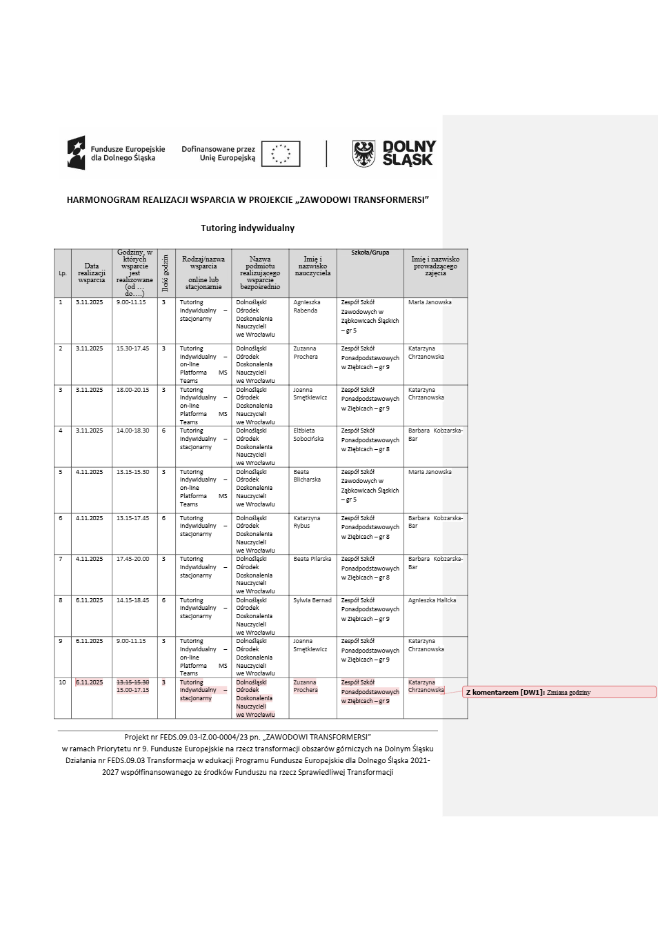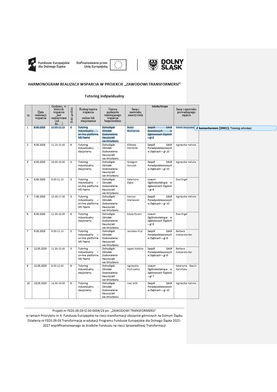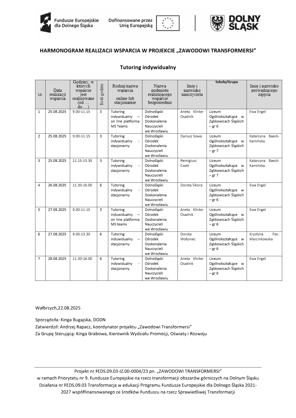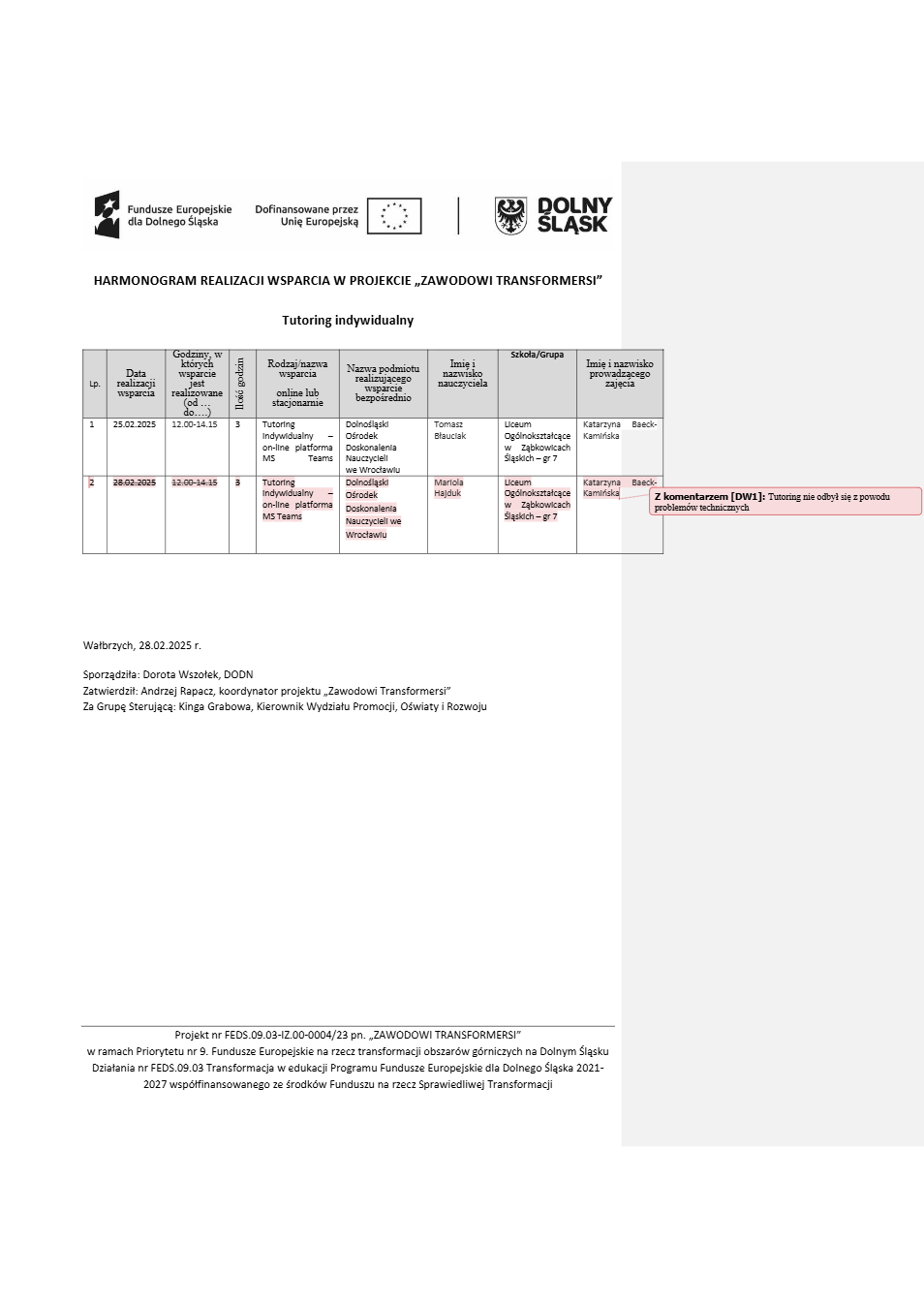 Projekt Zawodowi transformersi realizowany w ramach Priorytetu 9 „Fundusze Europejskie na rzecz transformacji obszarów górniczych na Dolnym Śląsku”, Działanie FEDS.09.03 Transformacja w edukacji, Programu Fundusze Europejskie dla Dolnego Śląska 2021 – 2027 spółfinansowanego ze środków Funduszu na rzecz Sprawiedliwej Transformacji.