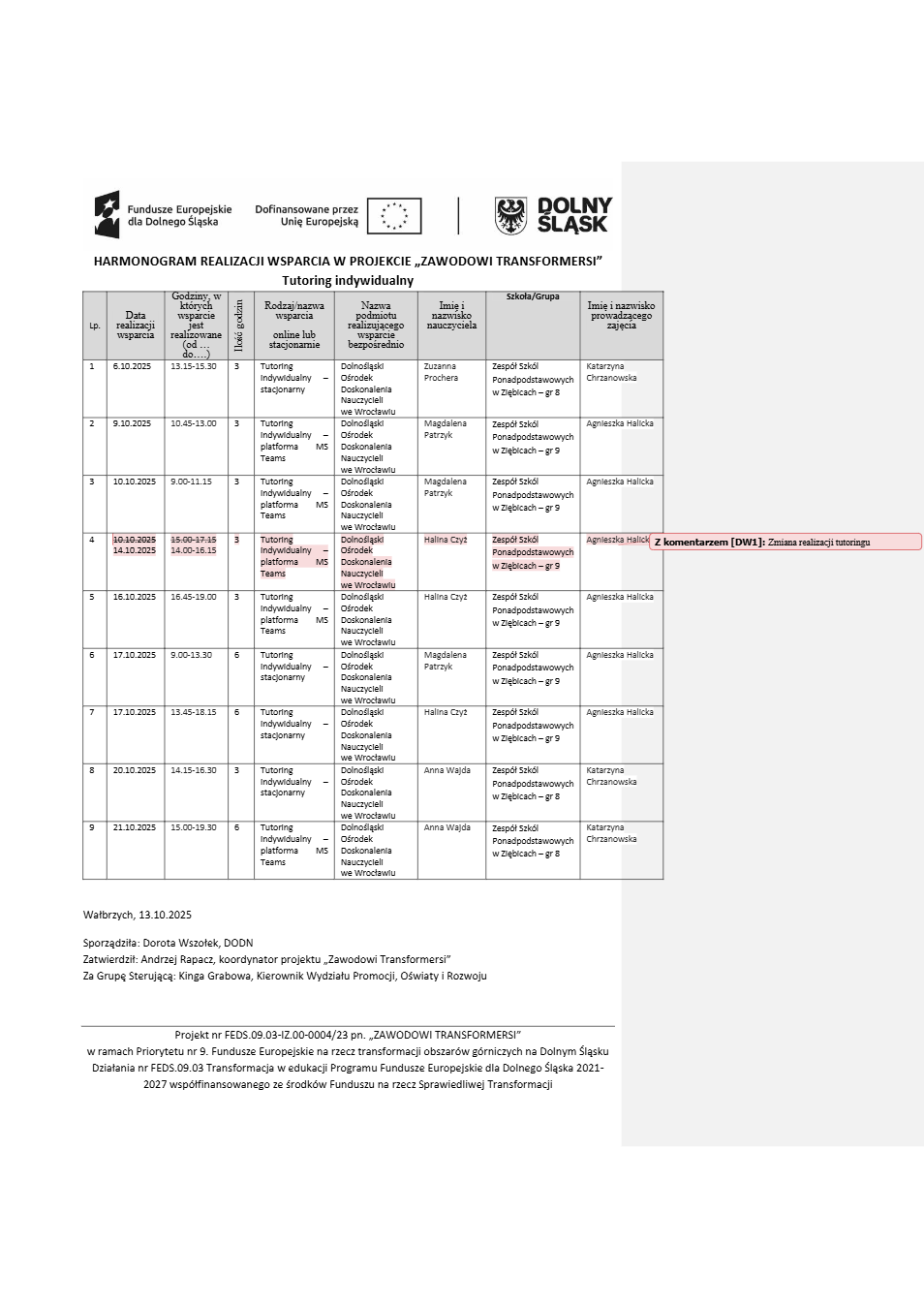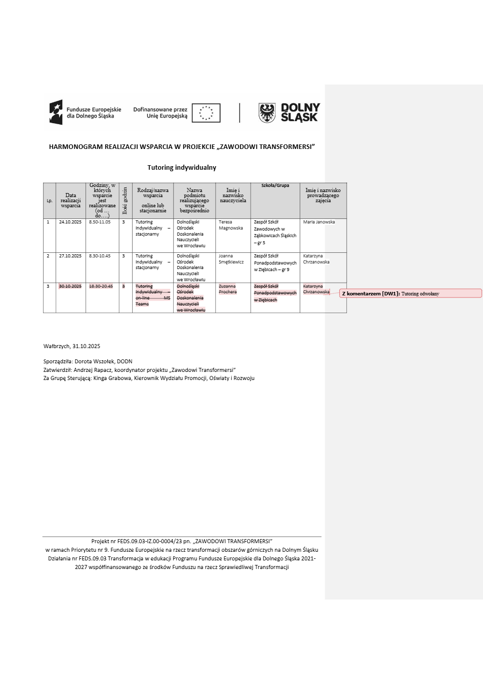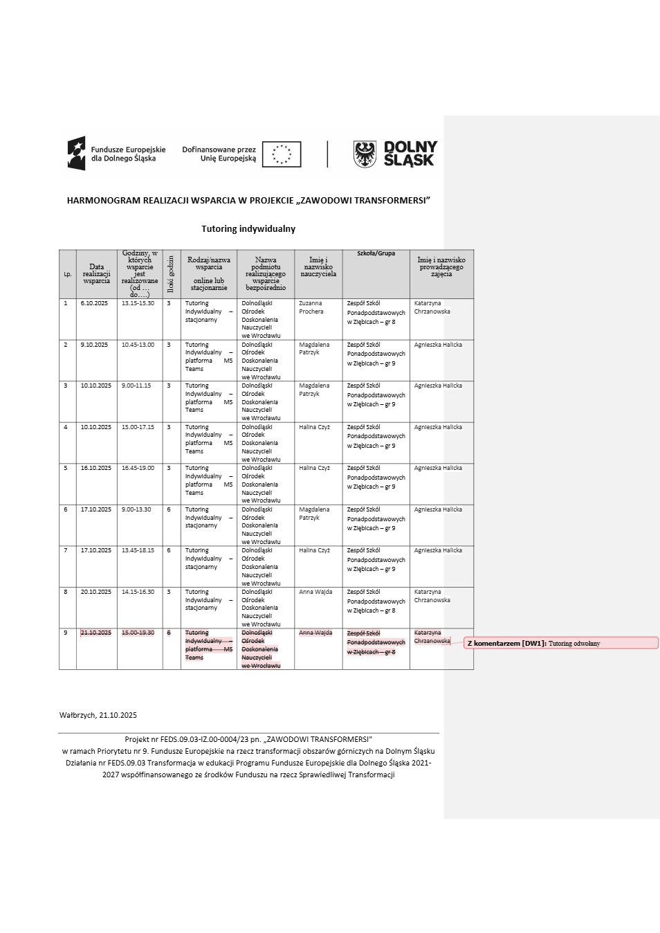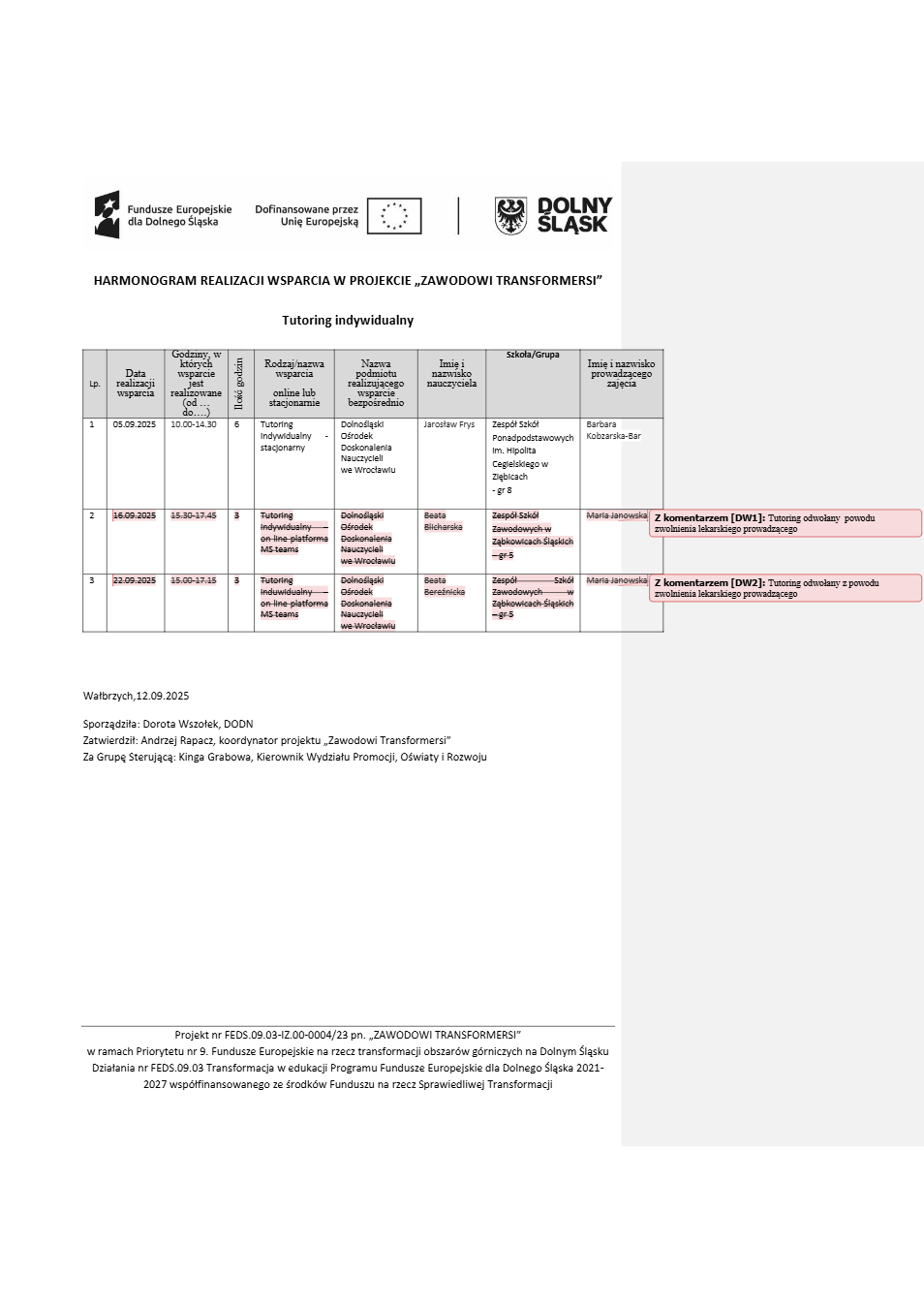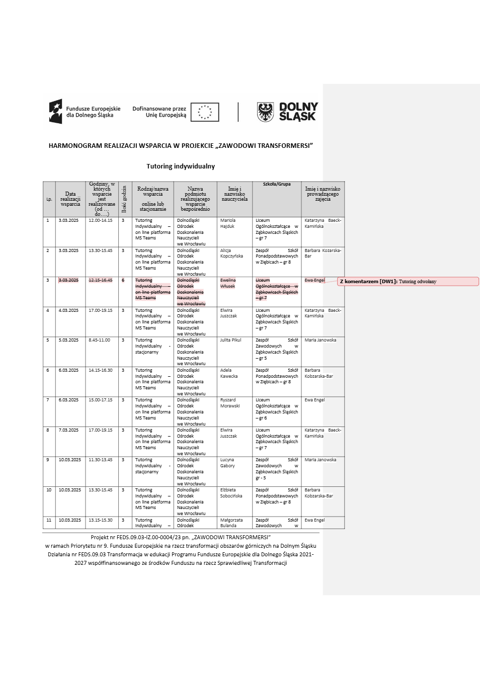 Projekt Zawodowi transformersi realizowany w ramach Priorytetu 9 „Fundusze Europejskie na rzecz transformacji obszarów górniczych na Dolnym Śląsku”, Działanie FEDS.09.03 Transformacja w edukacji, Programu Fundusze Europejskie dla Dolnego Śląska 2021 – 2027 spółfinansowanego ze środków Funduszu na rzecz Sprawiedliwej Transformacji.