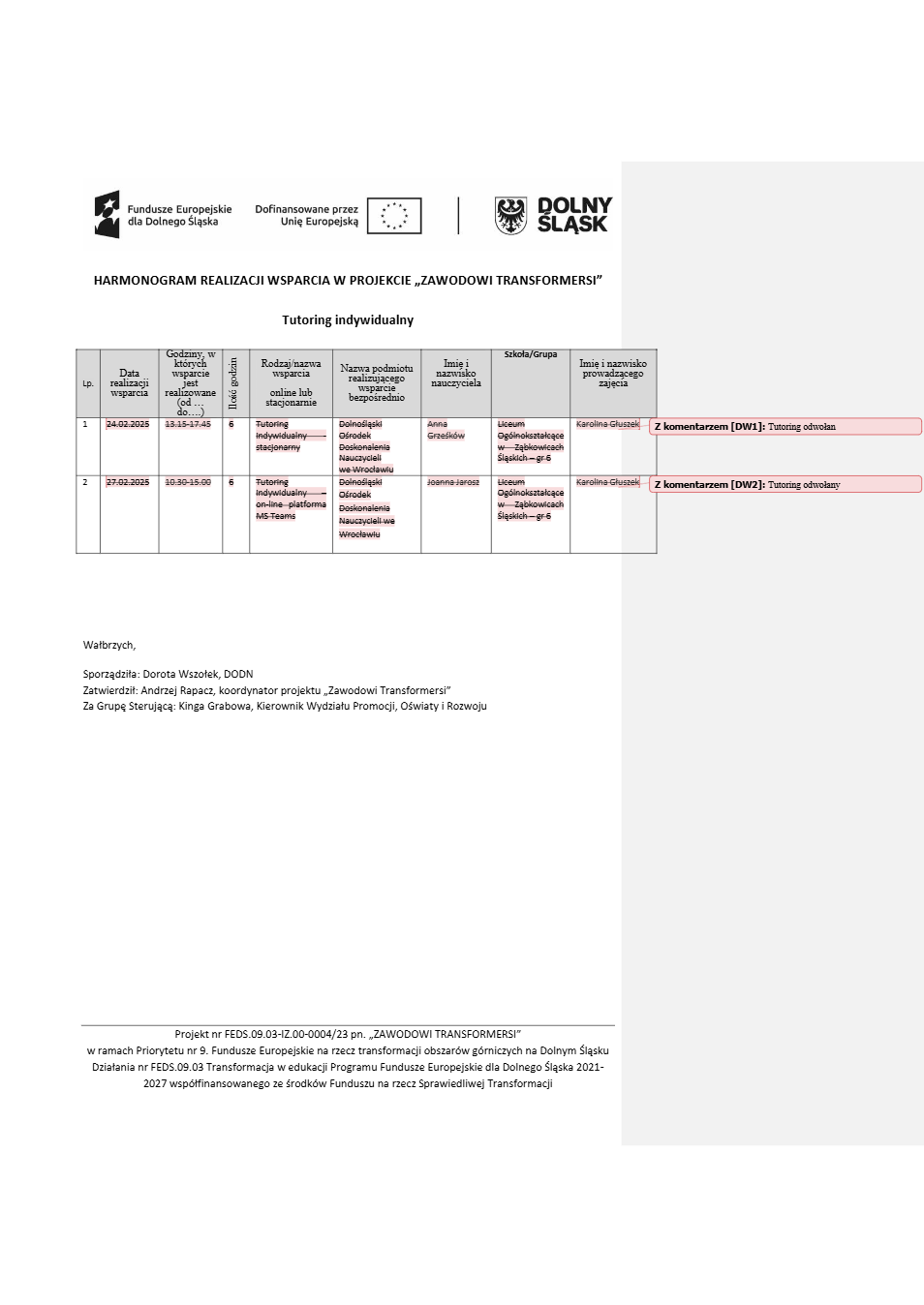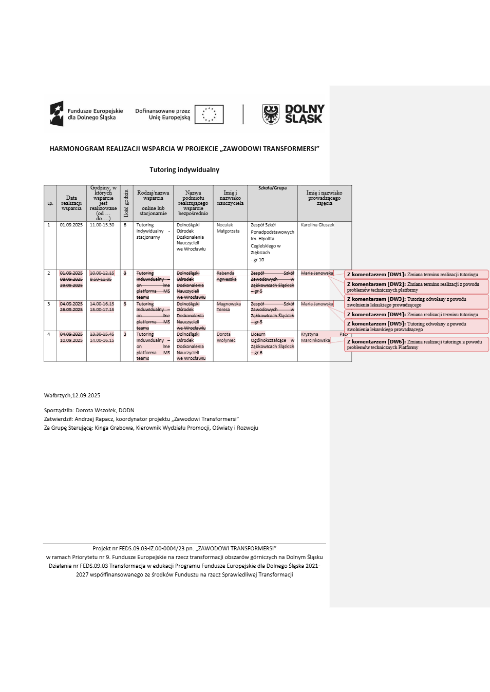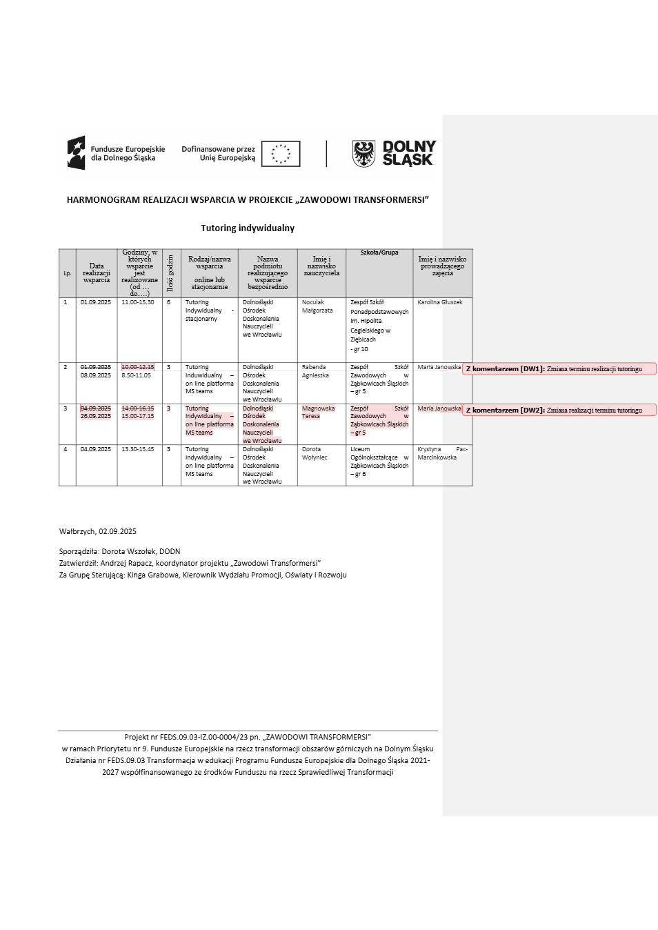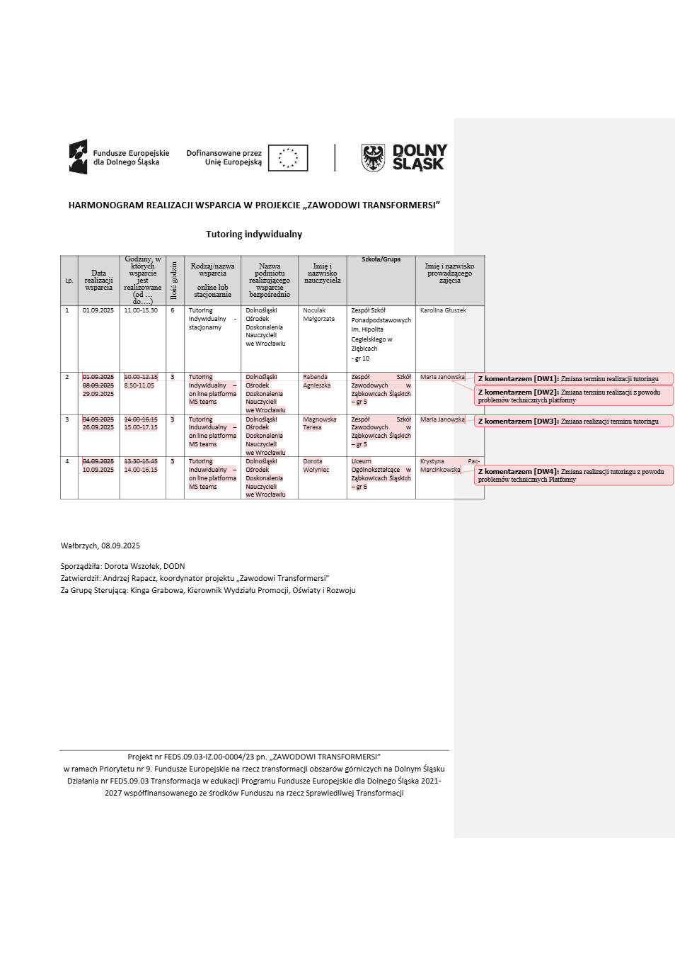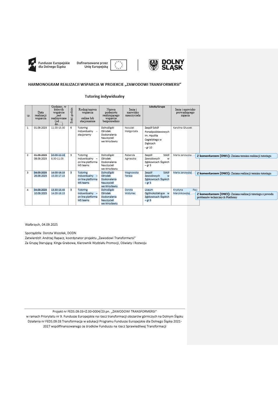 Projekt Zawodowi transformersi realizowany w ramach Priorytetu 9 „Fundusze Europejskie na rzecz transformacji obszarów górniczych na Dolnym Śląsku”, Działanie FEDS.09.03 Transformacja w edukacji, Programu Fundusze Europejskie dla Dolnego Śląska 2021 – 2027 spółfinansowanego ze środków Funduszu na rzecz Sprawiedliwej Transformacji.