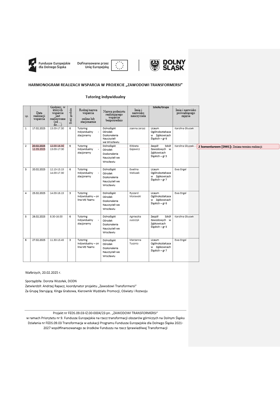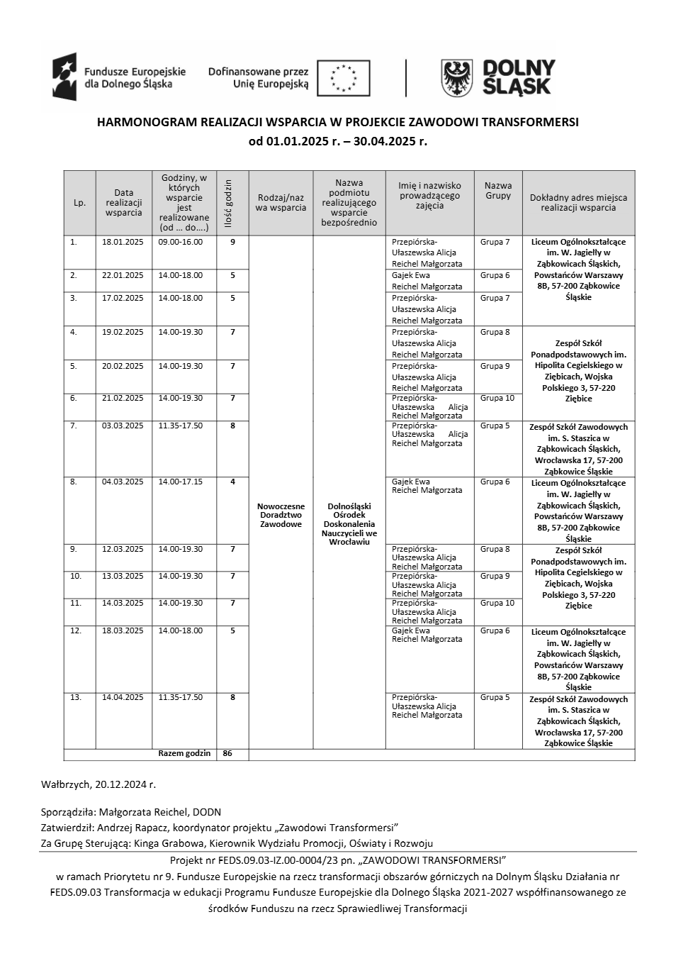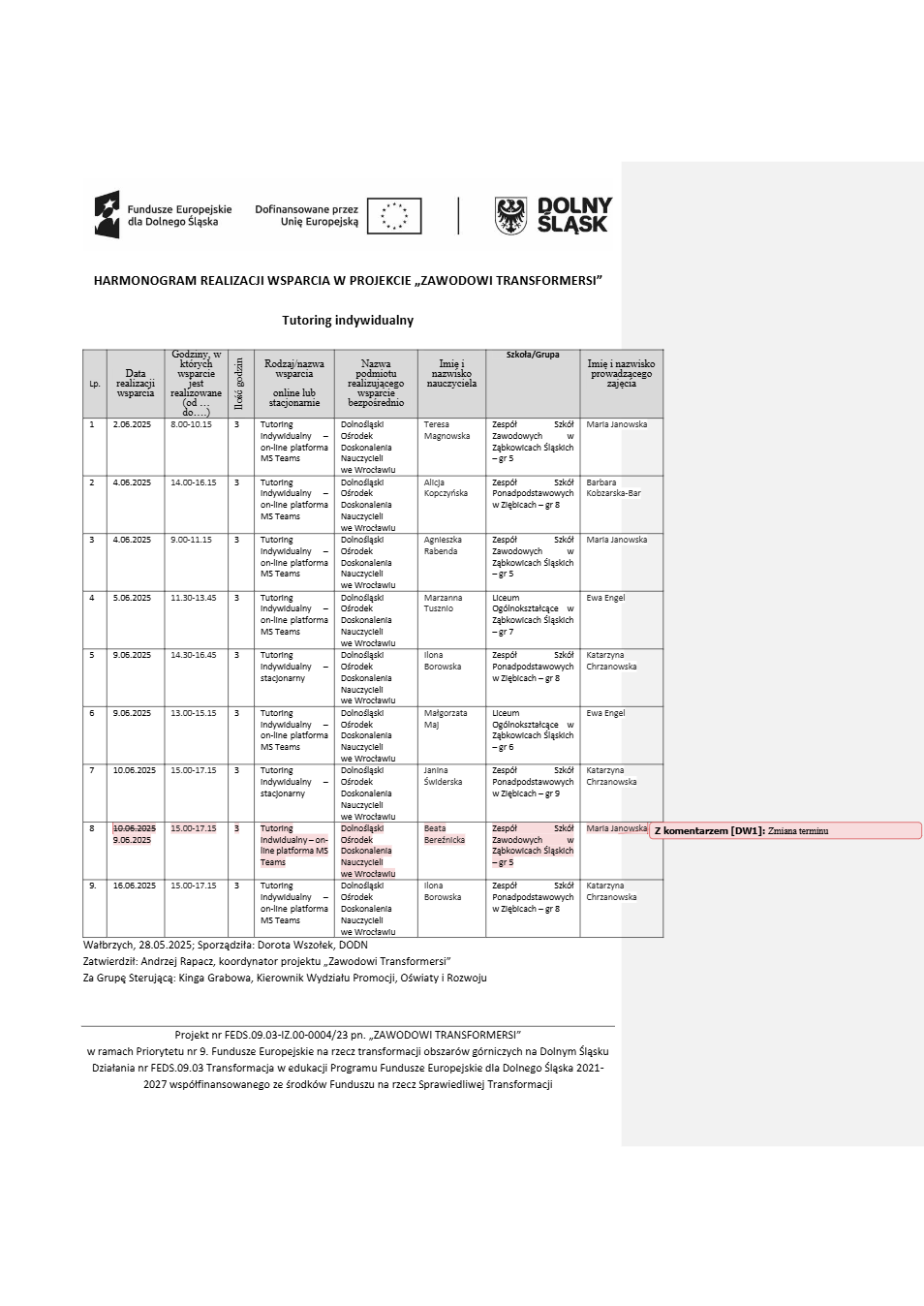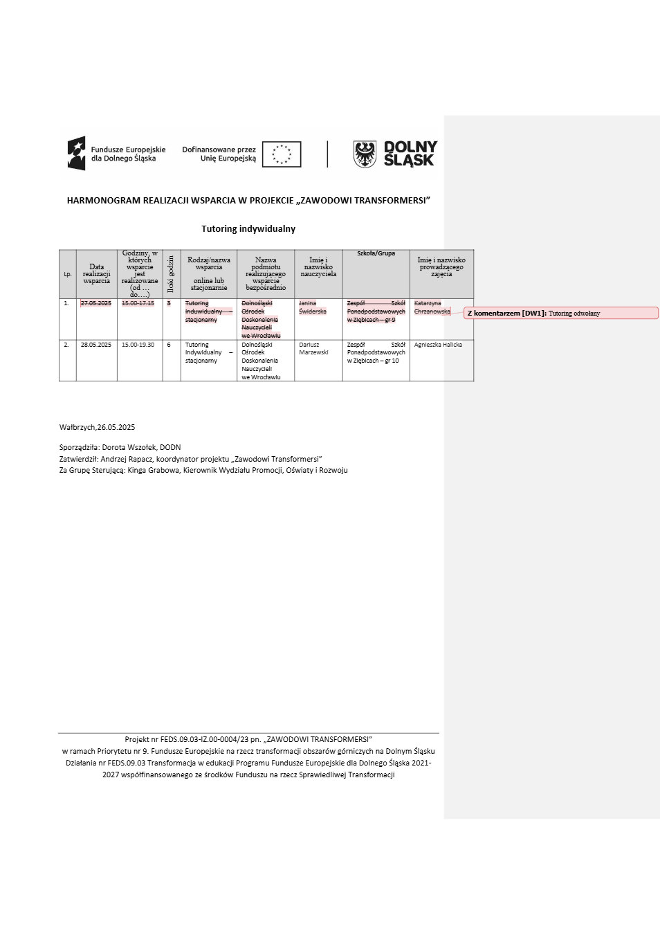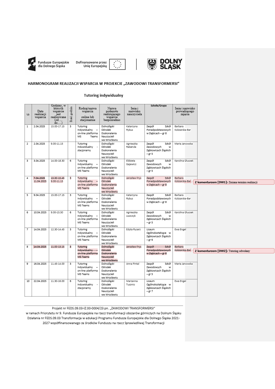 Projekt Zawodowi transformersi realizowany w ramach Priorytetu 9 „Fundusze Europejskie na rzecz transformacji obszarów górniczych na Dolnym Śląsku”, Działanie FEDS.09.03 Transformacja w edukacji, Programu Fundusze Europejskie dla Dolnego Śląska 2021 – 2027 spółfinansowanego ze środków Funduszu na rzecz Sprawiedliwej Transformacji.