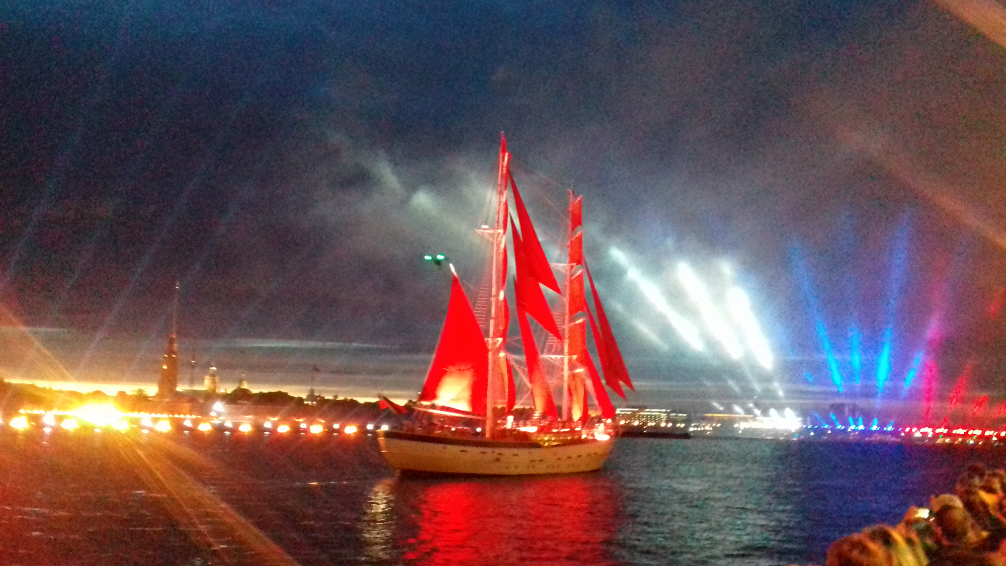 nazywa się „Алые паруса”. Tradycja festiwalu sięga roku 1968 r. „Szkarłatne żagle” 2019 przypadły na noc z 23 na 24 czerwca. „Szkarłatne żagle”, początkowo stworzone jako święto dla rosyjskich absolwentów, z czasem stały się ogromnym wydarzeniem, na które czekają miliony ludzi na całym świecie. Znanym symbolem festiwalu jest statek z czerwonymi żaglami, tak jak ten opisany w tytułowej opowieści „Szkarłatne żagle” rosyjskiego powieściopisarza Aleksandra Grina. Opowieść mówi o młodej dziewczynie, której kazano czekać na statek ze szkarłatnymi żaglami, który zabierze ją do miejsca, w którym spełniają się marzenia. Spektakl składa się z dwóch głównych części: koncertu na Placu Pałacowym