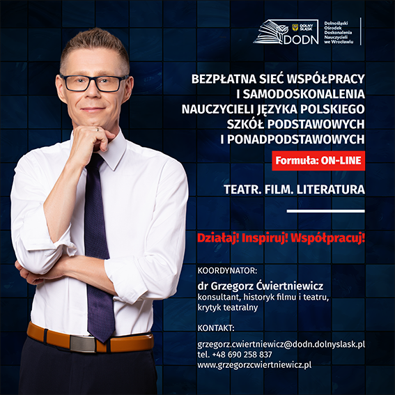 Od 1 września 2025 r. poszerzyła się oferta Dolnośląskiego Ośrodka Doskonalenia Nauczycieli we Wrocławiu. Do grona nauczycieli-konsultantów dołączył pan Grzegorz Ćwiertniewicz, który proponuje nauczycielom języka polskiego dolnośląskich szkół podstawowych i ponadpodstawowych dołączenie do sieci współpracy i samodoskonalenia pn. „MEDIUM ARTYSTYCZNE I EDUKACYJNE. TEATR TELEWIZJI W PRACY POLONISTY”. Szczegółowe informacje zamieszczone są poniżej: