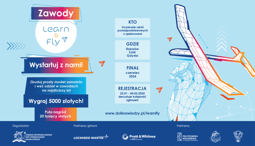 Fundacja Wspierania Edukacji przy Stowarzyszeniu “Dolina Lotnicza” zaprasza do uczestniczenia w ogólnopolskim projekcie Learn&Fly Udział w organizowanym projekcie jest BEZPŁATNY, potrzebne są tylko chęci uczestników.