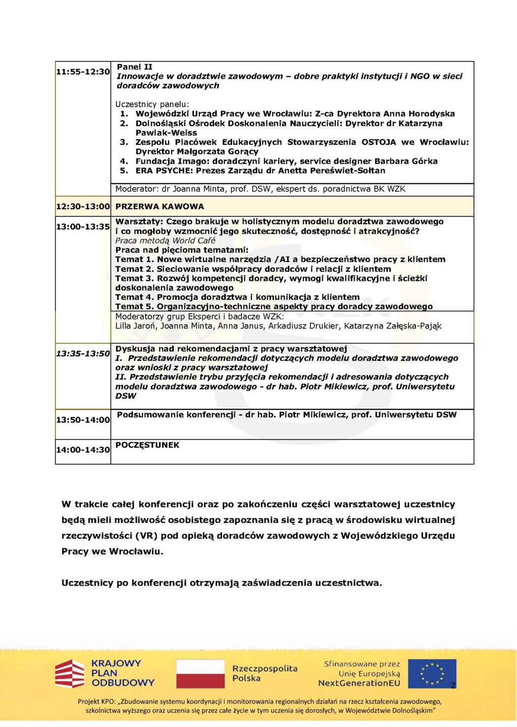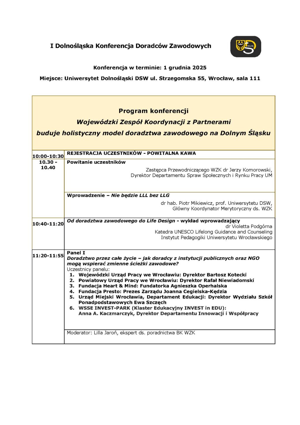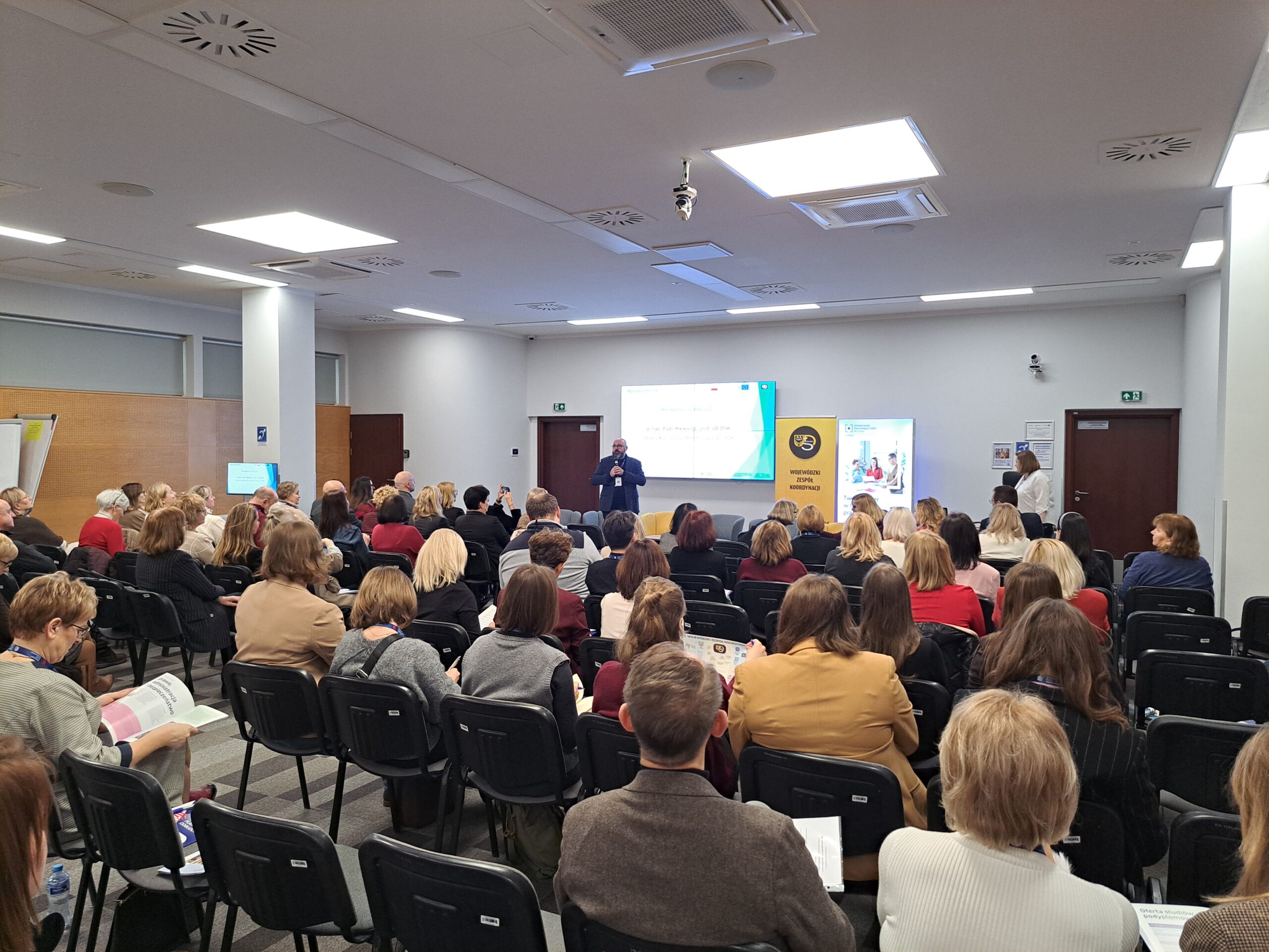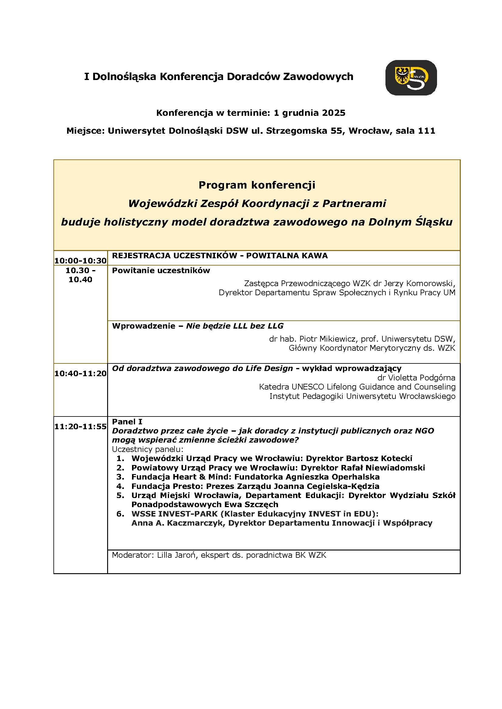 W dniu 1.12.2025 r. na Uniwersytecie Dolnośląskim we Wrocławiu, na zaproszenie Przewodniczącego WZK – Wicemarszałka Województwa Dolnośląskiego Pana Wojciecha Bochnaka, odbyła się Konferencja pn. „I Dolnośląska Konferencja Doradców Zawodowych – Wojewódzki Zespół Koordynacji z Partnerami buduje holistyczny model doradztwa zawodowego na Dolnym Śląsku” organizowana w ramach działalności Wojewódzkiego Zespołu Koordynacji. Wydarzenie to było elementem projektu „Zbudowanie systemu koordynacji i monitorowania regionalnych działań na rzecz kształcenia zawodowego, szkolnictwa wyższego oraz uczenia się przez całe życie, w tym uczenia się dorosłych, w województwie dolnośląskim”, finansowanym ze środków Krajowego Planu Odbudowy. Konferencja, w której uczestniczyło 103 osoby – przedstawiciele.