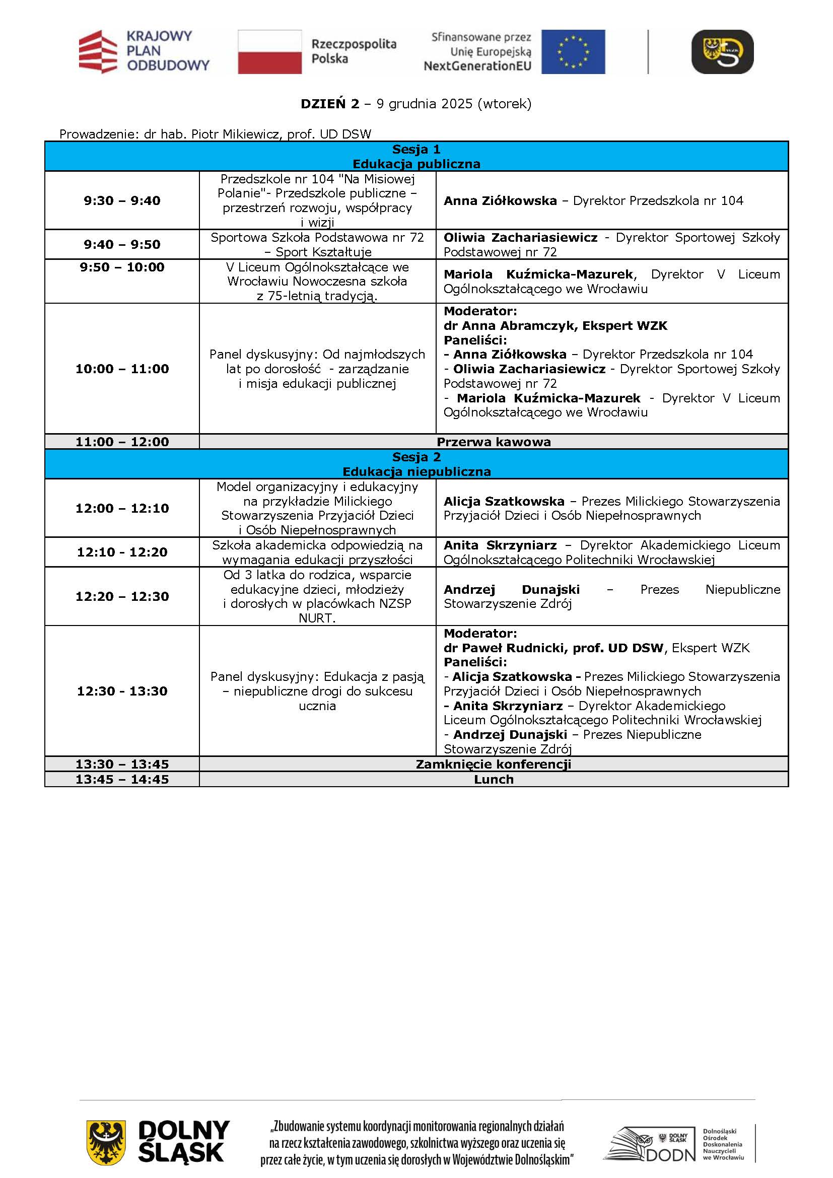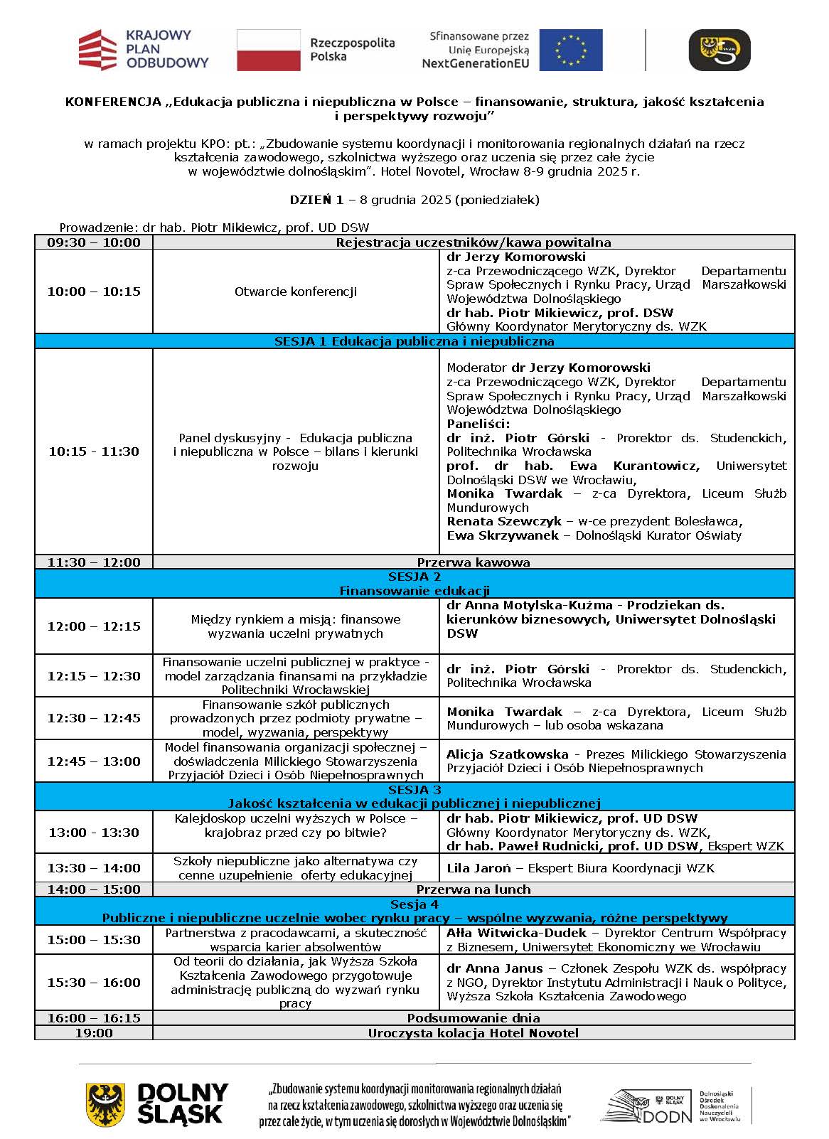 W dniach 08-09.XII.2025 r. w hotelu Novotel we Wrocławiu, na zaproszenie Przewodniczącego WZK – Wicemarszałka Województwa Dolnośląskiego Pana Wojciecha Bochnaka, odbyła się Konferencja pn. „Edukacja publiczna i niepubliczna w Polsce – finansowanie, struktura, jakość kształcenia