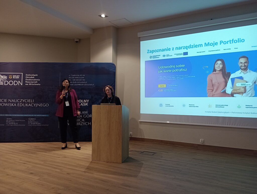 Irmina Sokulska i Katarzyna Pałęcka z Instytutu Badań Edukacyjnych zaprezentowały następnie cyfrowe narzędzie „Moje portfolio”, które umożliwia obserwację indywidualnego rozwoju uczniów i gromadzenie w jednym miejscu sukcesów osiąganych w edukacji formalnej i pozaformalnej.