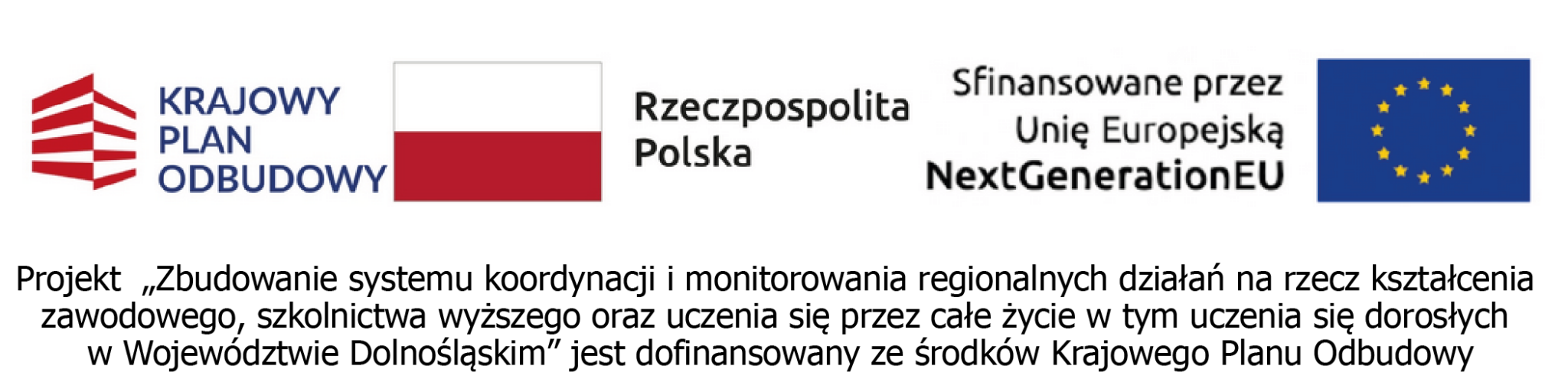Projekt „Zbudowanie systemu koordynacji i monitorowania regionalnych działań na rzecz kształcenia zawodowego, szkolnictwa wyższego oraz uczenia się przez całe życie w tym uczenia się dorosłych, w Województwie Dolnośląskim” dofinansowany ze środków Krajowego Planu Odbudowy realizowany jest w okresie od 1 stycznia 2023 r. do 30 czerwca 2026 r.