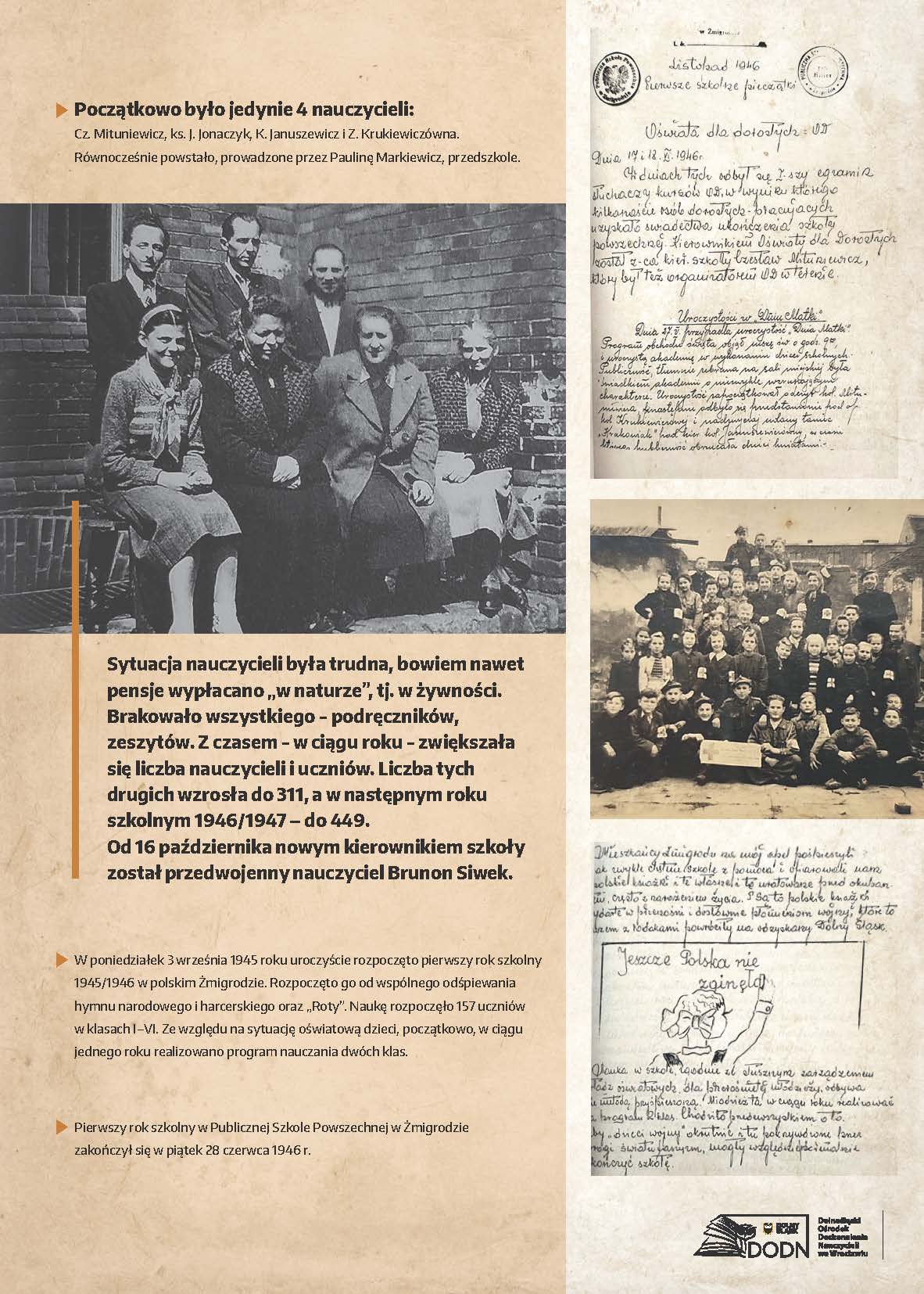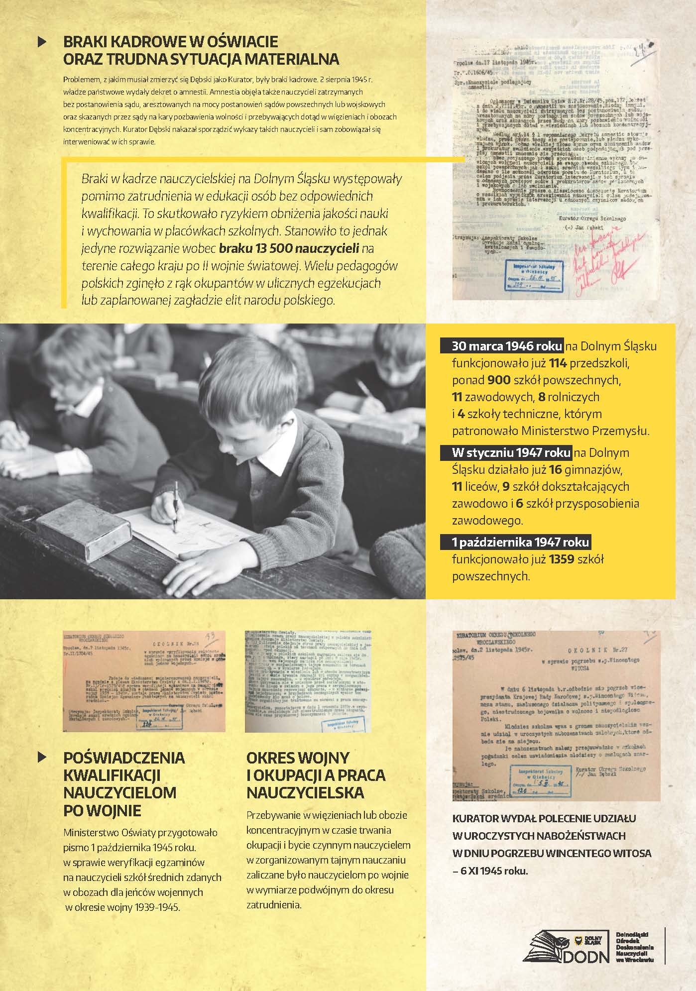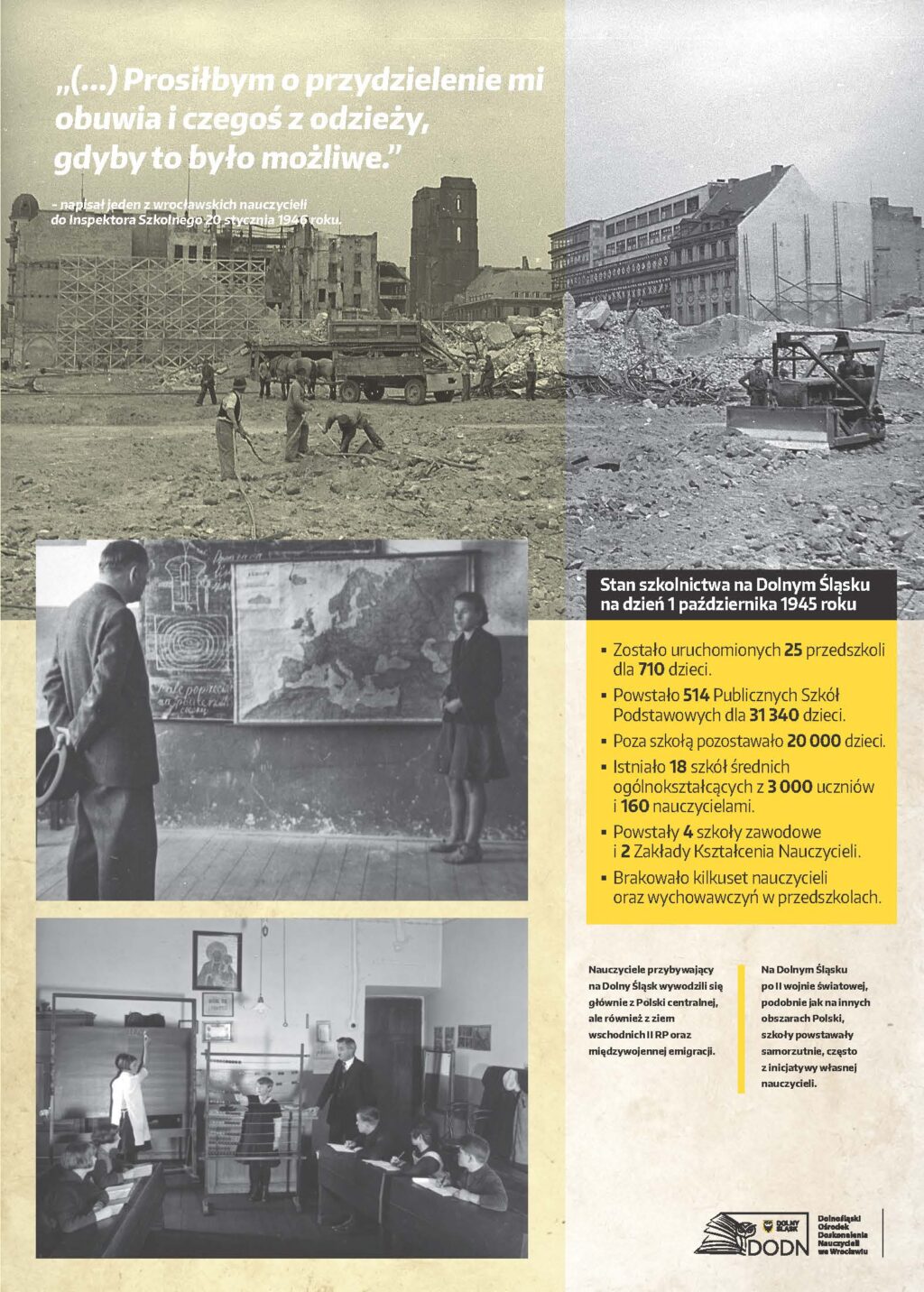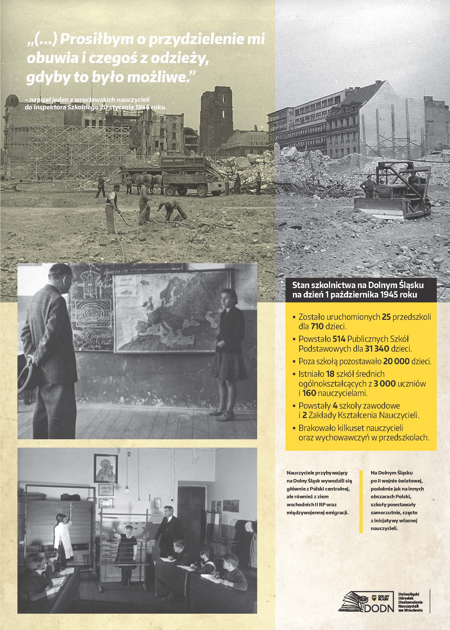 Dolnośląski Ośrodek Doskonalenia Nauczycieli we Wrocławiu zaprasza na wystawę poświęconą początkom polskiej edukacji na Dolnym Śląsku w latach 1945–1947, przygotowaną z okazji 80. rocznicy wybrzmienia pierwszego dzwonka w placówkach oświatowych na Dolnym Śląsku.