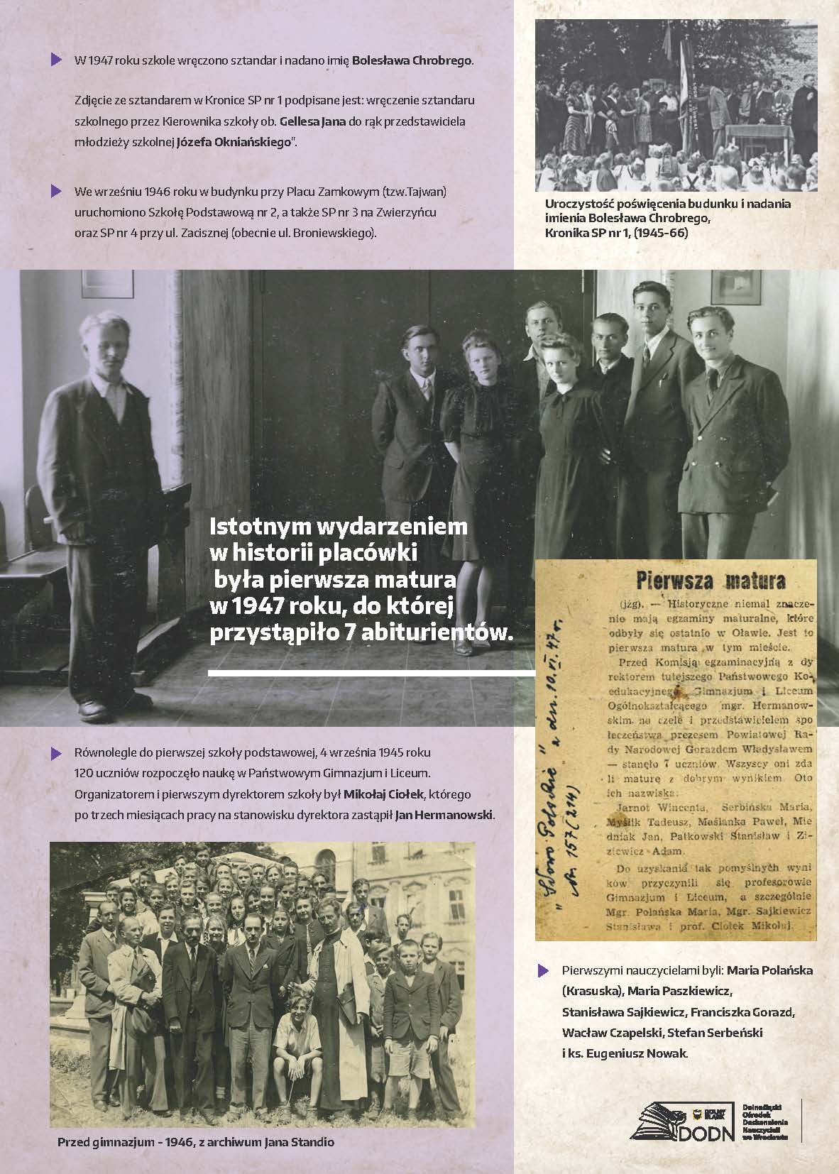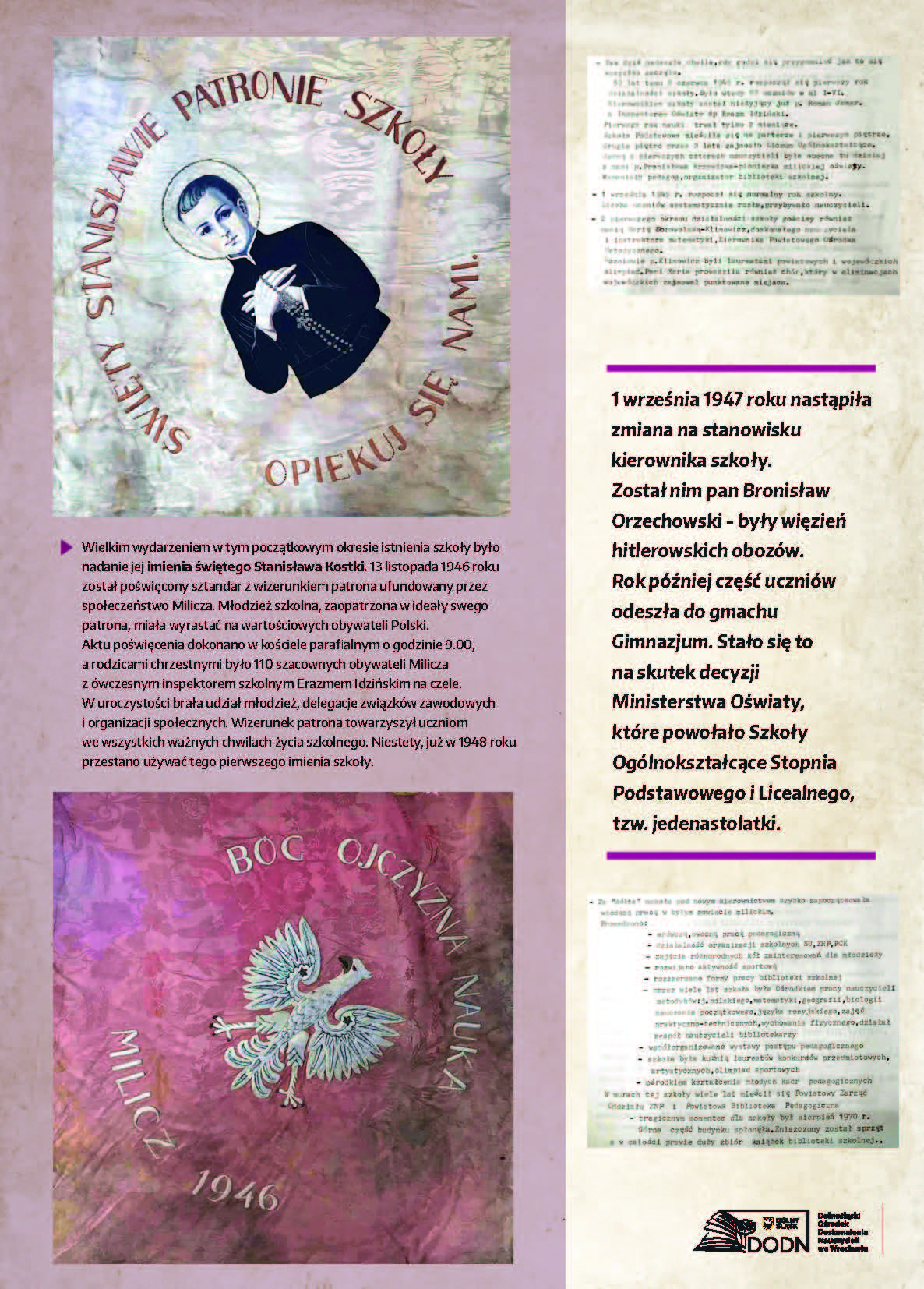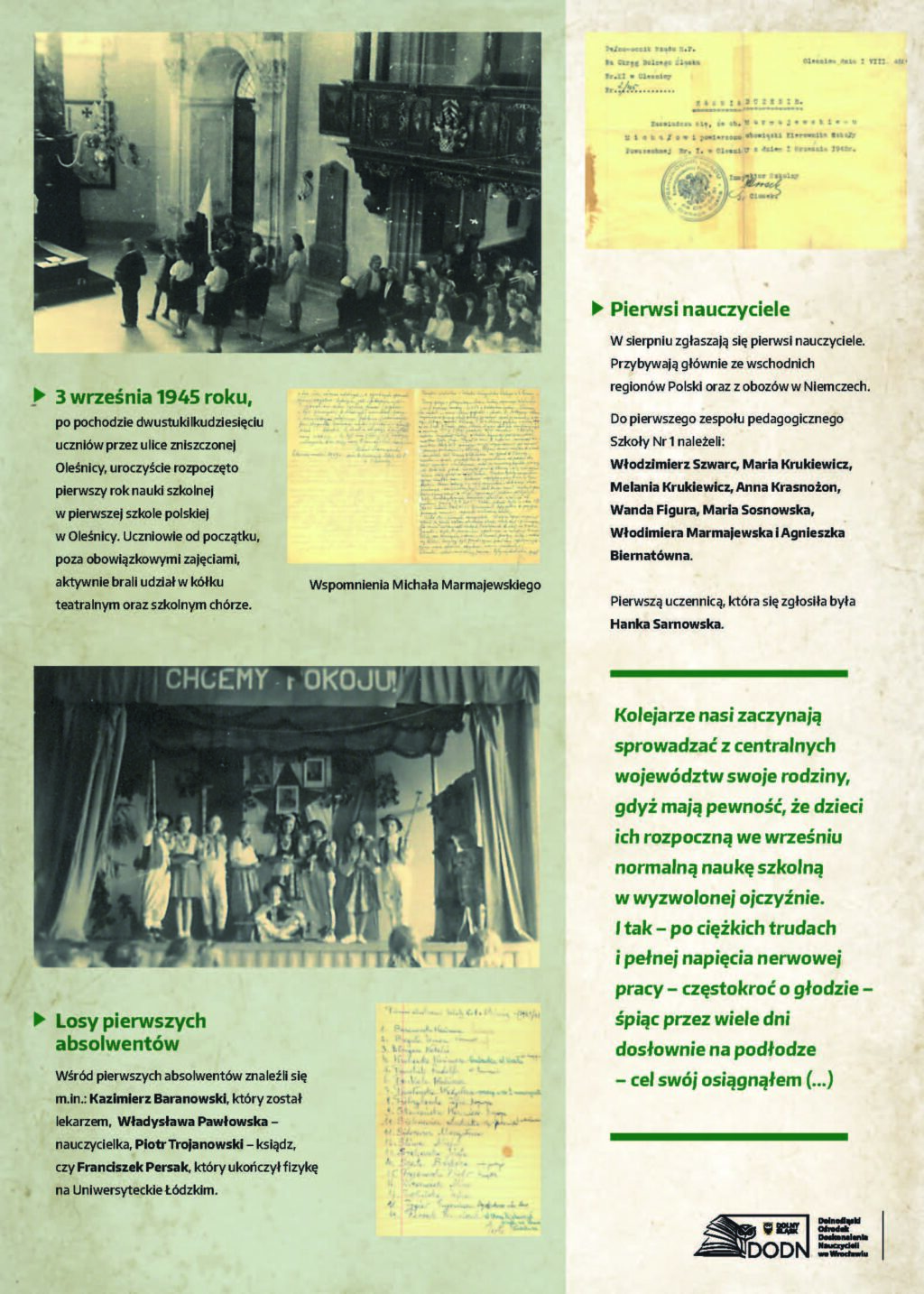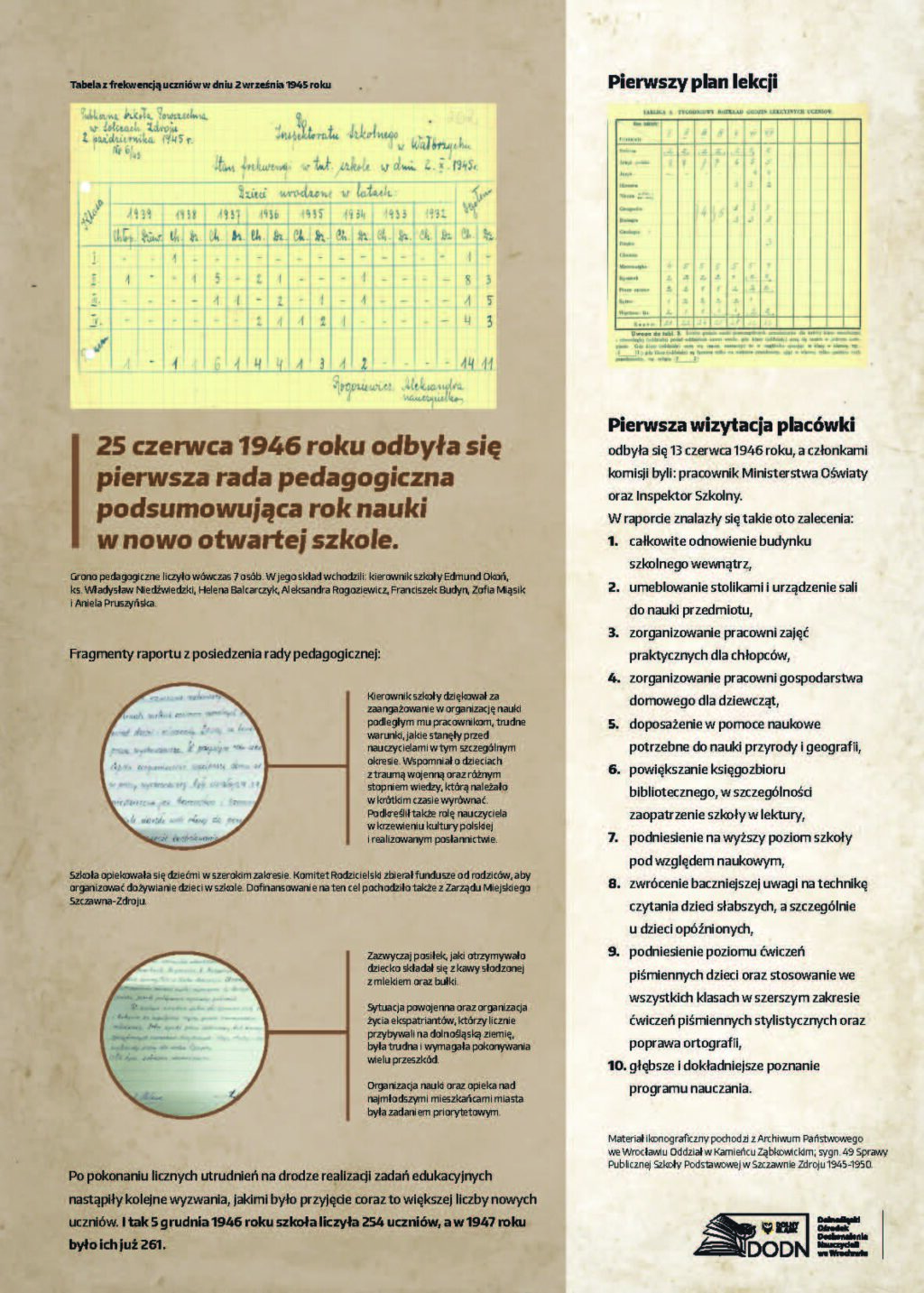 Dolnośląski Ośrodek Doskonalenia Nauczycieli we Wrocławiu zaprasza na wystawę poświęconą początkom polskiej edukacji na Dolnym Śląsku w latach 1945–1947, przygotowaną z okazji 80. rocznicy wybrzmienia pierwszego dzwonka w placówkach oświatowych na Dolnym Śląsku.